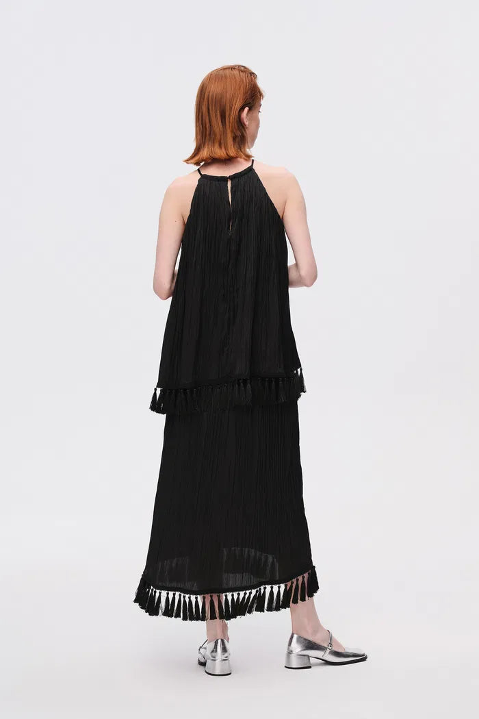 Para un vestido negro de verano que es todo menos básico. El vestido Undine está diseñado para esos giros espontáneos y días relajados. Con flecos que se mueven al ritmo, es una versión única del clásico midi negro que hace que cualquier día sea un poco más especial.
