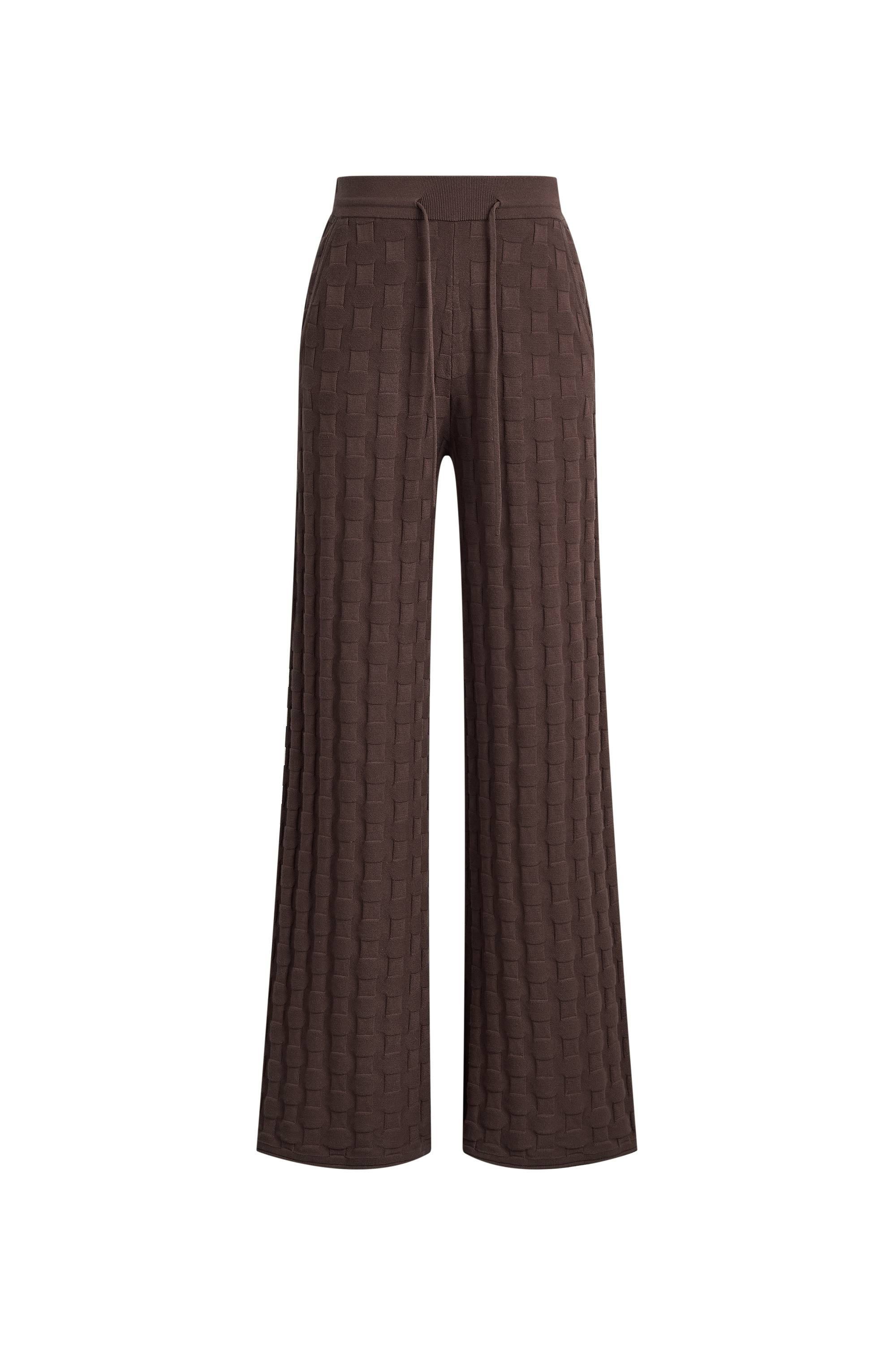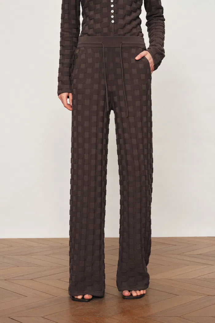 Estos pantalones de punto de pierna ancha usan un patrón único de tablero de ajedrez texturizado para aportar una sensación acogedora y relajada al uso diario. El fino hilo de algodón se mantiene fresco contra la piel, mientras que la cintura con cordón añade un toque deportivo.