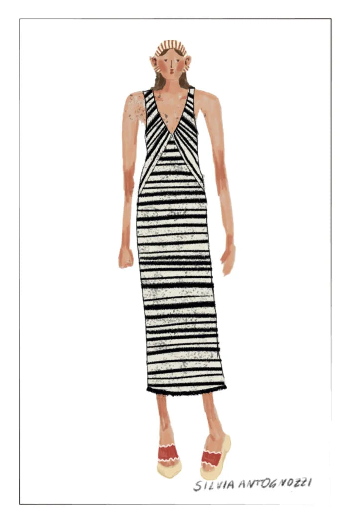 Un vestido que captura el espíritu del verano. Las rayas en blanco y negro se inspiran en sombrillas vintage de playa, mientras que las texturas únicas de punto crean un movimiento sutil. Las borlas hechas a mano añaden el encanto justo de la costa.