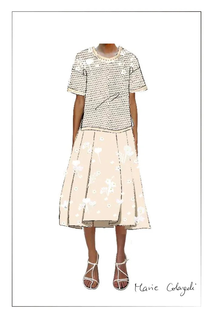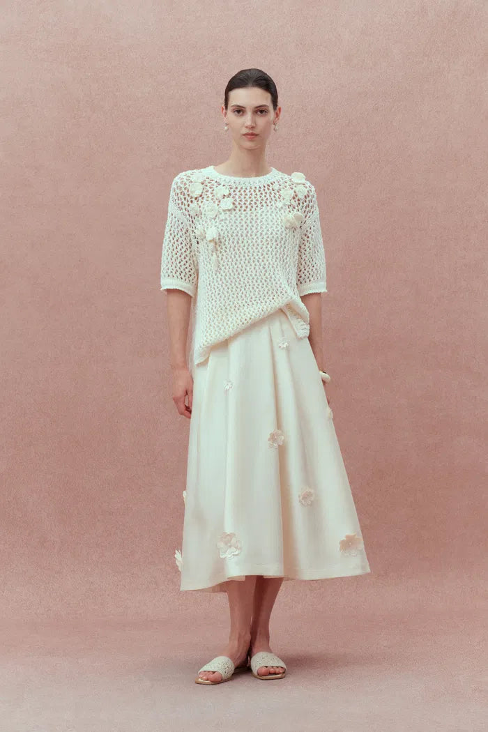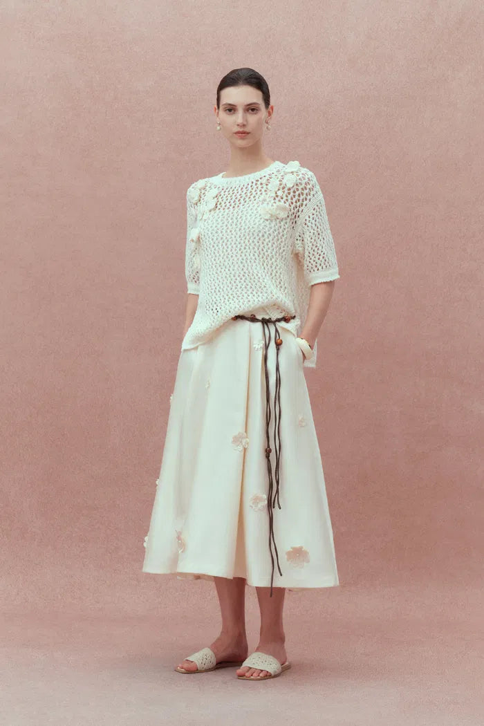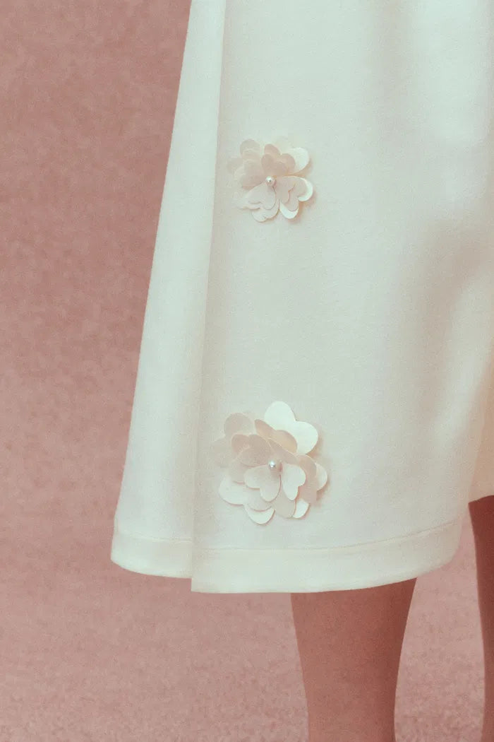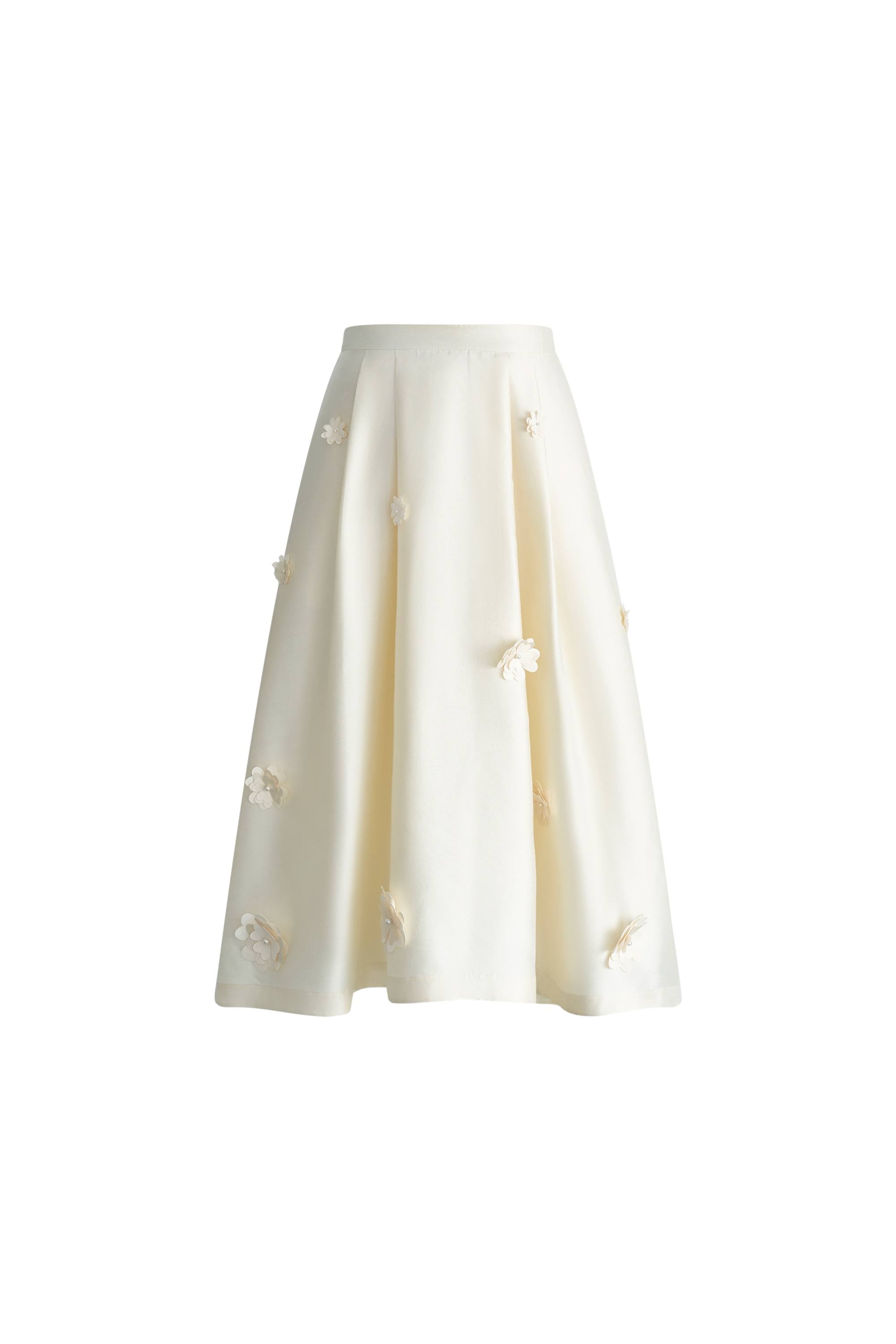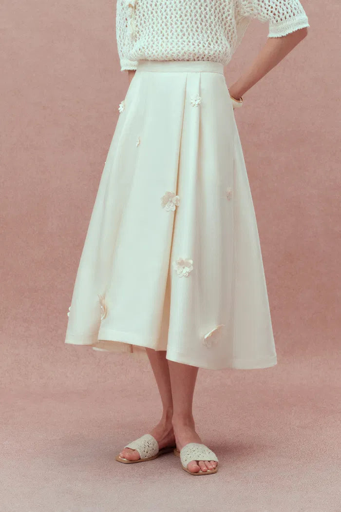 Esta falda Lea presenta quince flores dimensionales hechas a mano sobre un lujoso satén de seda y lana. La cintura alta crea una proporción elegante, mientras que los pliegues sutiles añaden movimiento. Los bolsillos ocultos brindan practicidad a esta pieza verdaderamente artística que captura la poesía de la camelia.