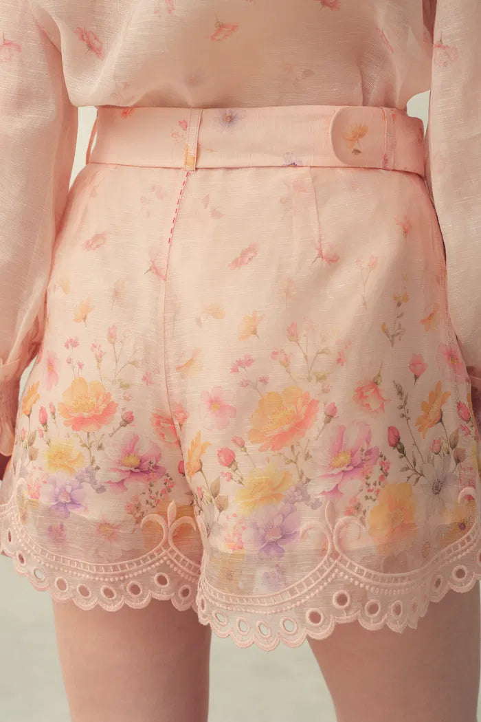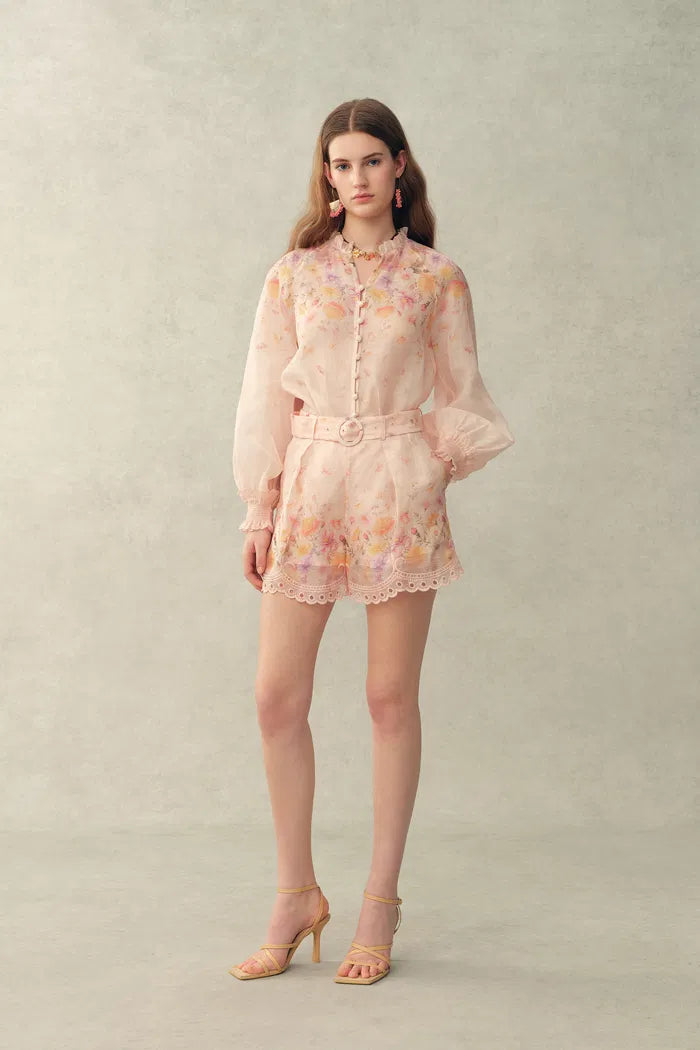 Conjunto de blusa y shorts Lillian con bordado floral pintado a mano, estampado ombré transparente en organza de seda y lino