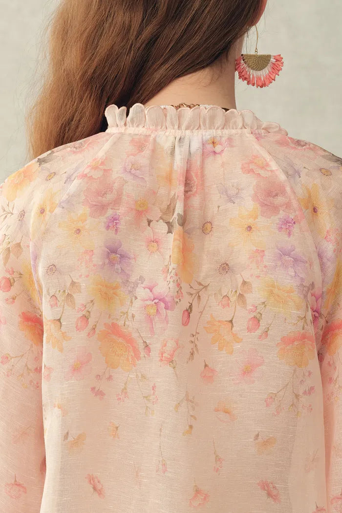 Esta blusa transparente de seda y lino combina un estampado floral suavemente sombreado con un cuello de pie con volantes y un delicado borde floral en las mangas. El dobladillo curvado y la forma cómoda la mantienen ligera y fresca, convirtiéndola en una prenda ideal para superponer en climas cálidos.