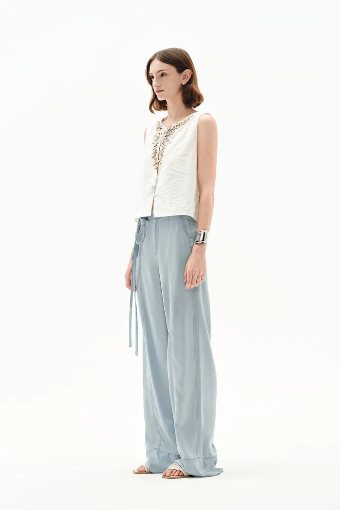 El denim claro entra en su era de comodidad. Nuestra mezcla de lyocell y acetato hace que caiga como seda pero se use como denim, mientras que esos lazos delgados en la cintura añaden opciones de estilo. El corte de pierna ancha que hace que el denim de verano se sienta realmente fresco.
