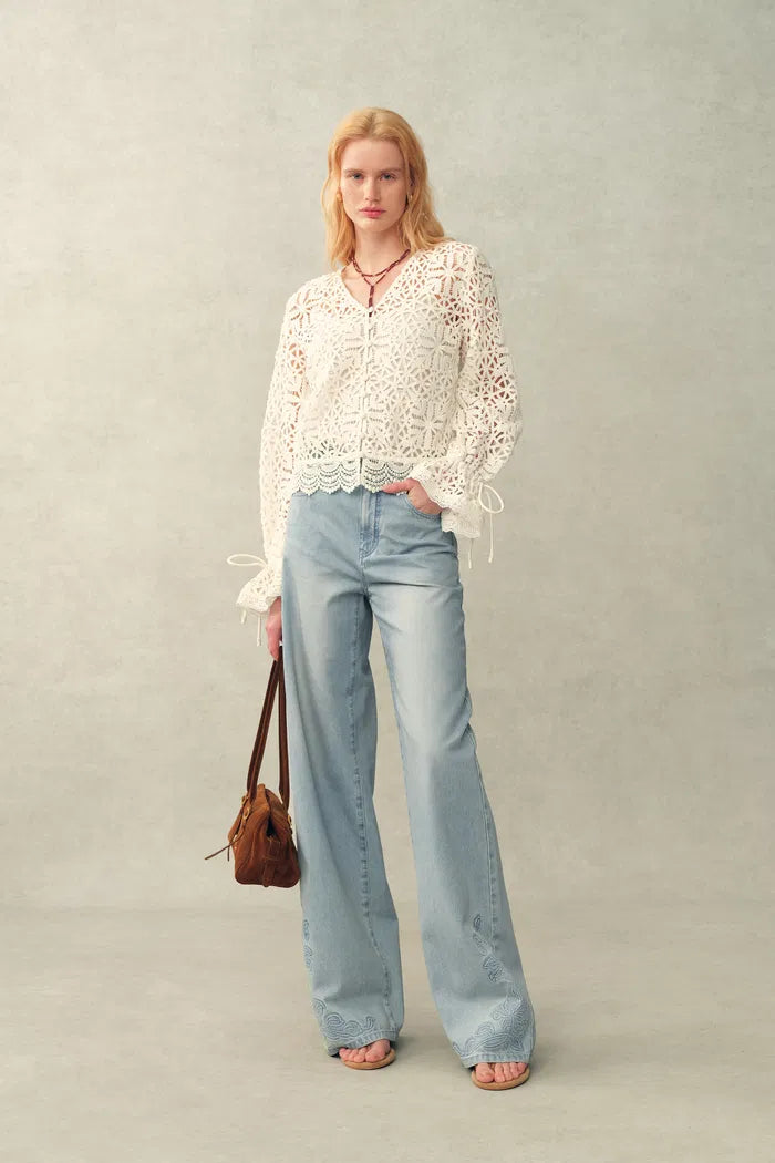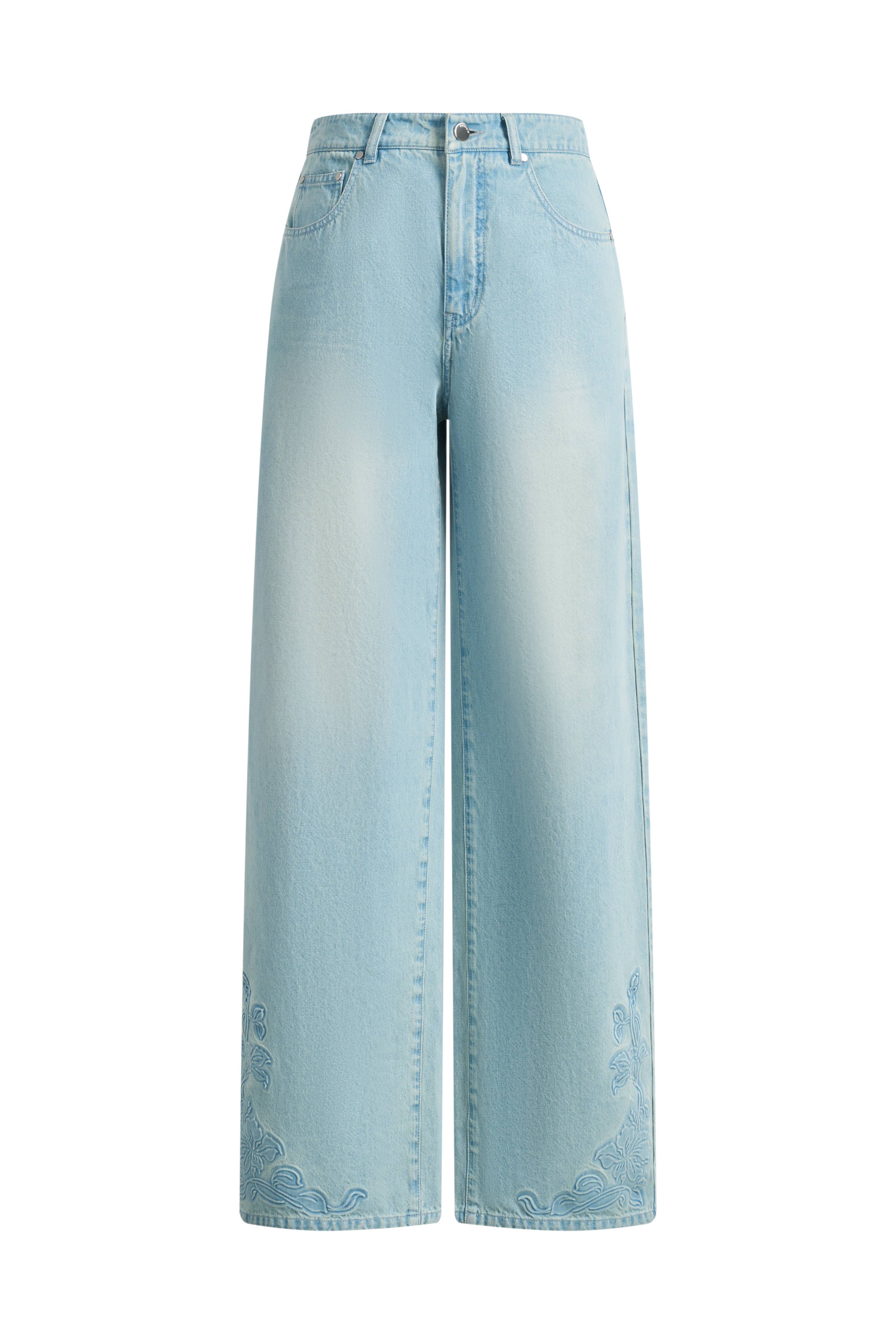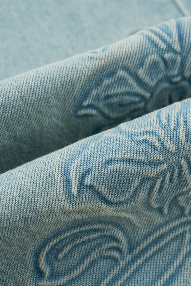 Un denim retro azul claro con flores en relieve aporta dimensión y textura a una silueta recta y ancha favorecedora. El lavado ligero suaviza la tela para un uso cómodo, mientras que los contrastes claros y oscuros ayudan a realzar la línea de la pierna.