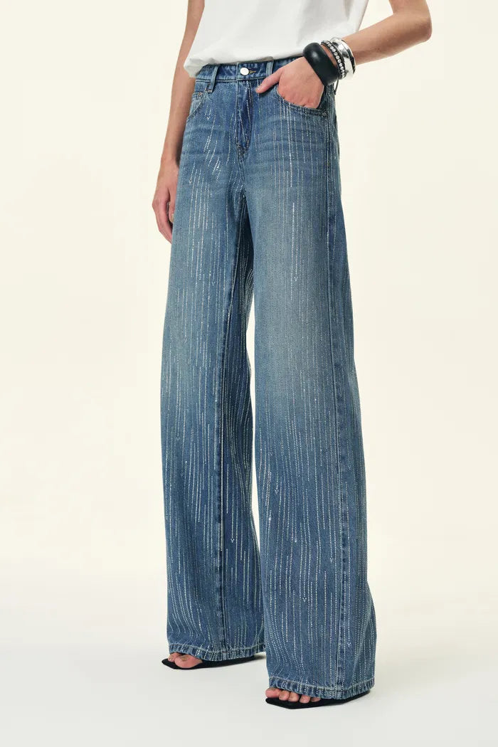 Estos jeans lavados combinan un detalle de pedrería en cascada con una silueta recta de pierna ancha. Hechos de DENIM 100% algodón, se sienten suaves después del lavado mientras mantienen un ajuste estructurado.