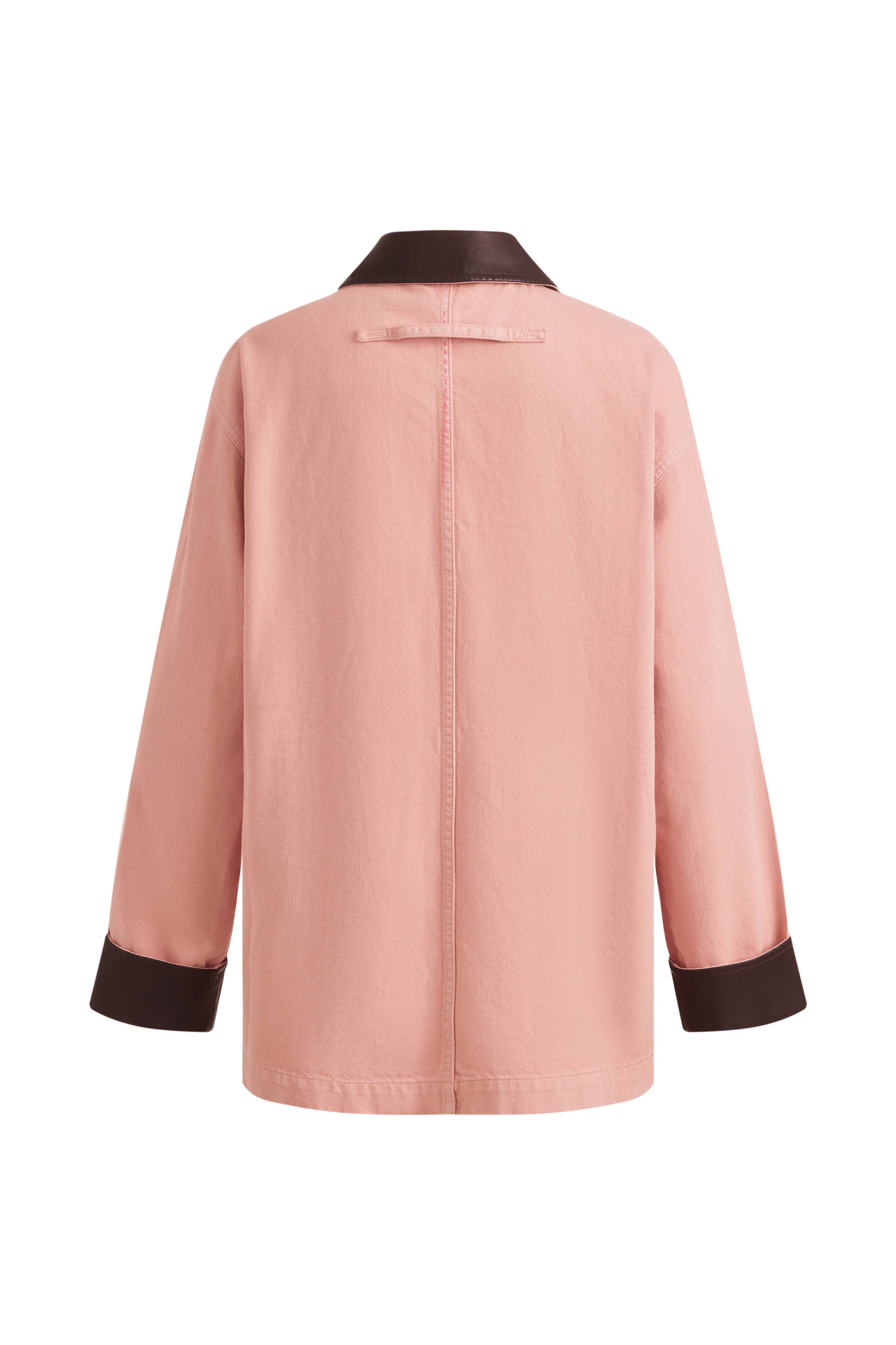 Ropa de trabajo en rosa polvoriento, pero con estilo: una chaqueta tipo granero con cuero tipo gamuza en el cuello y los puños para contraste. Sobredimensionada y relajada, pero los materiales le dan un toque más moderno que una chaqueta casual promedio.