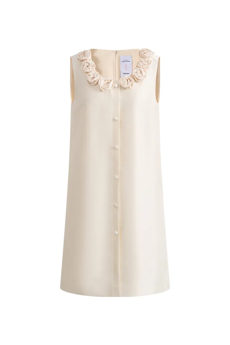 Este vestido de punto en línea A presenta rosas hechas a mano a lo largo de un suave escote en U. La mezcla de seda y lana ofrece un brillo suave, equilibrando líneas arquitectónicas con una energía elegante y femenina que se siente atemporal.
