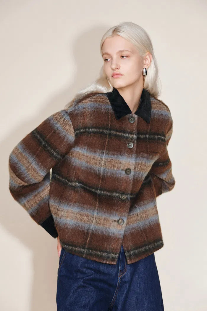 El patrón de cuadros en degradado azul-marrón captura las ondas de la aurora nórdica en una transformación fantástica hacia una textura suave de lana afelpada. El corte relajado incluye pinzas en las mangas para un interés dimensional. El cuello de pana añade profundidad en capas haciendo referencia a la ropa de trabajo diaria.