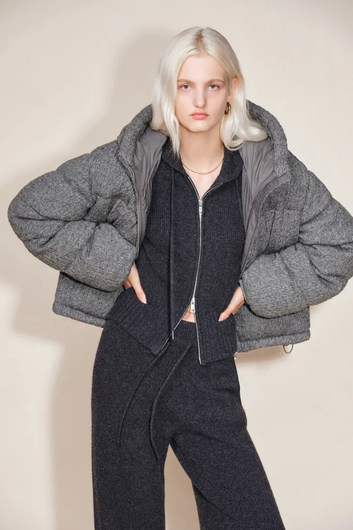 Una mezcla de textura de punto y calidez de plumón. El exterior suave de punto trenzado se combina con un relleno de plumón zonificado en el interior para un aspecto completo pero fluido. Diseñada con capucha y puños acanalados para mayor protección contra el viento en un clásico tono gris humo.