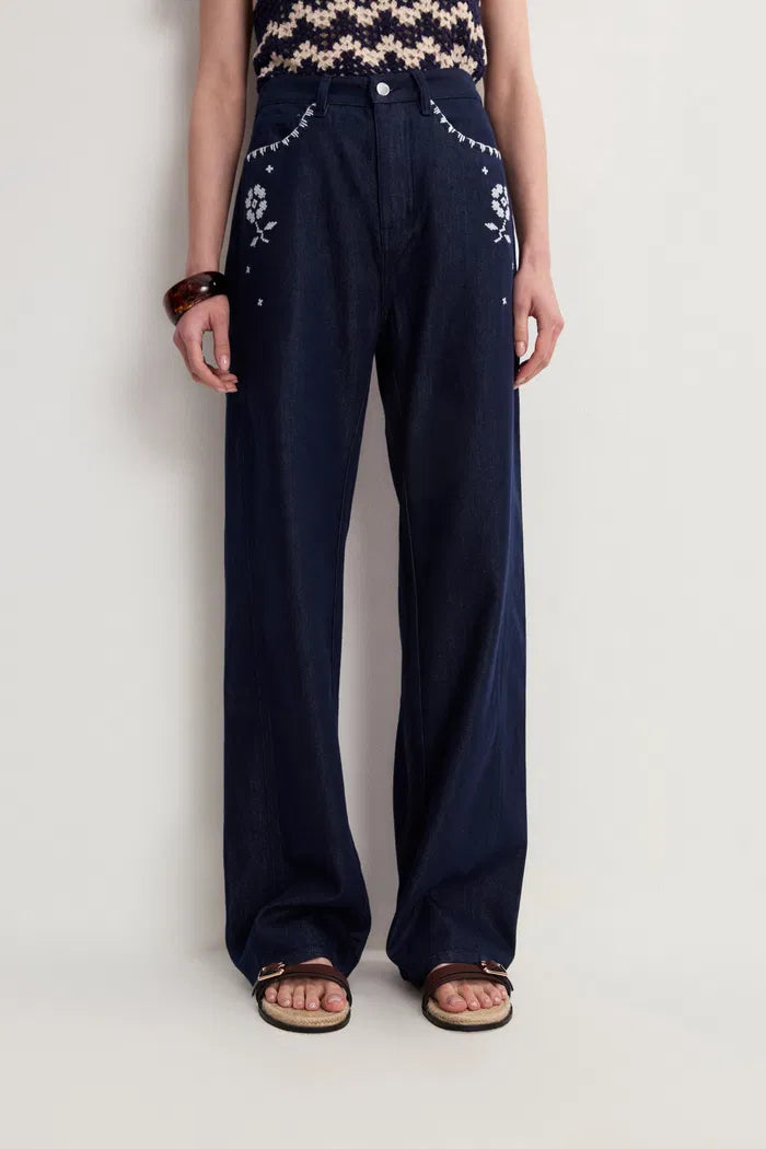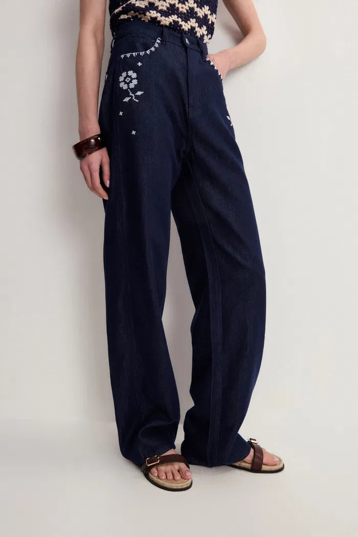 Un enfoque audaz al bordado y al clásico denim, estos jeans de pierna recta presentan flores meticulosamente bordadas a punto cruz. El denim crudo desarrolla carácter con el tiempo, mientras que el corte relajado funciona tanto para días casuales como para salidas nocturnas. La actualización perfecta para tu colección de denim.