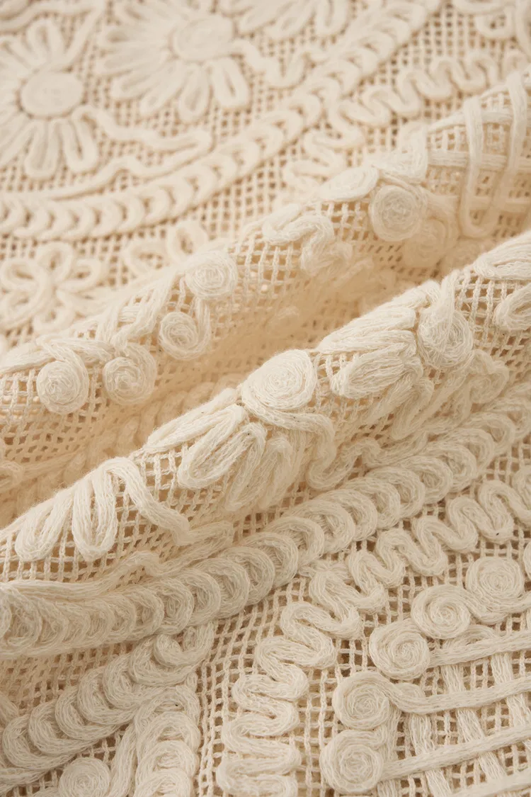 Hilo de algodón tejido en encaje de estilo vintage. Suave y transpirable con una textura calada, combinando un patrón intrincado con comodidad diaria.