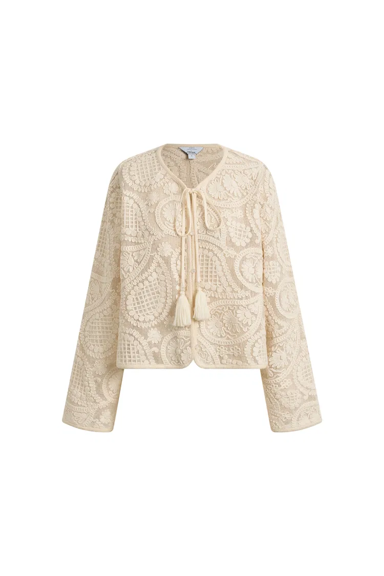 Esta capa estilo crochet tiene la facilidad de una prenda de vacaciones pero se siente lo suficientemente pulida para la ciudad. La textura aireada de algodón, el lazo con borlas al frente y la silueta suavemente moldeada le dan un encanto relajado que se desliza fácilmente sobre conjuntos simples de verano.