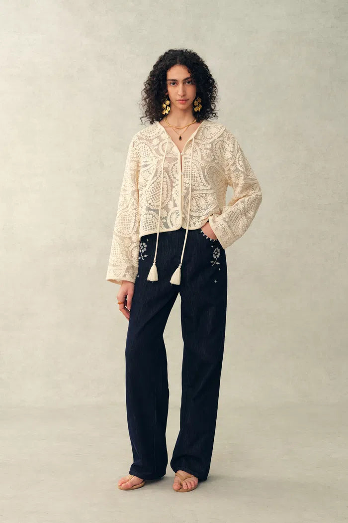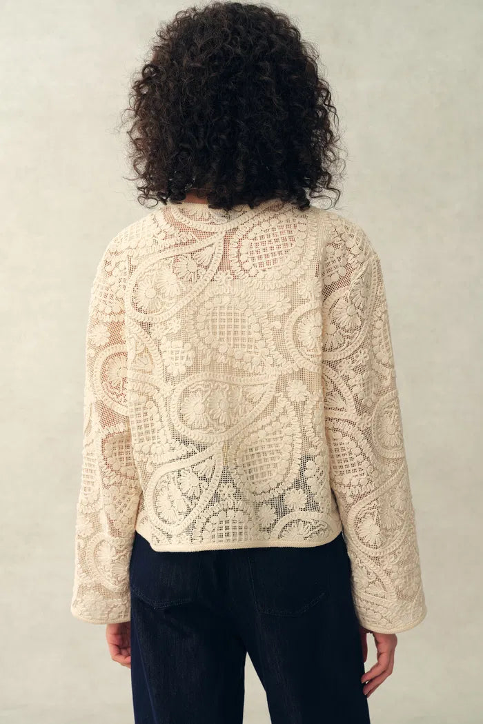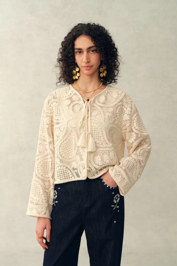 Blusa transparente con borlas y lazo, diseño paisley de crochet Hazel, 100% algodón con encaje