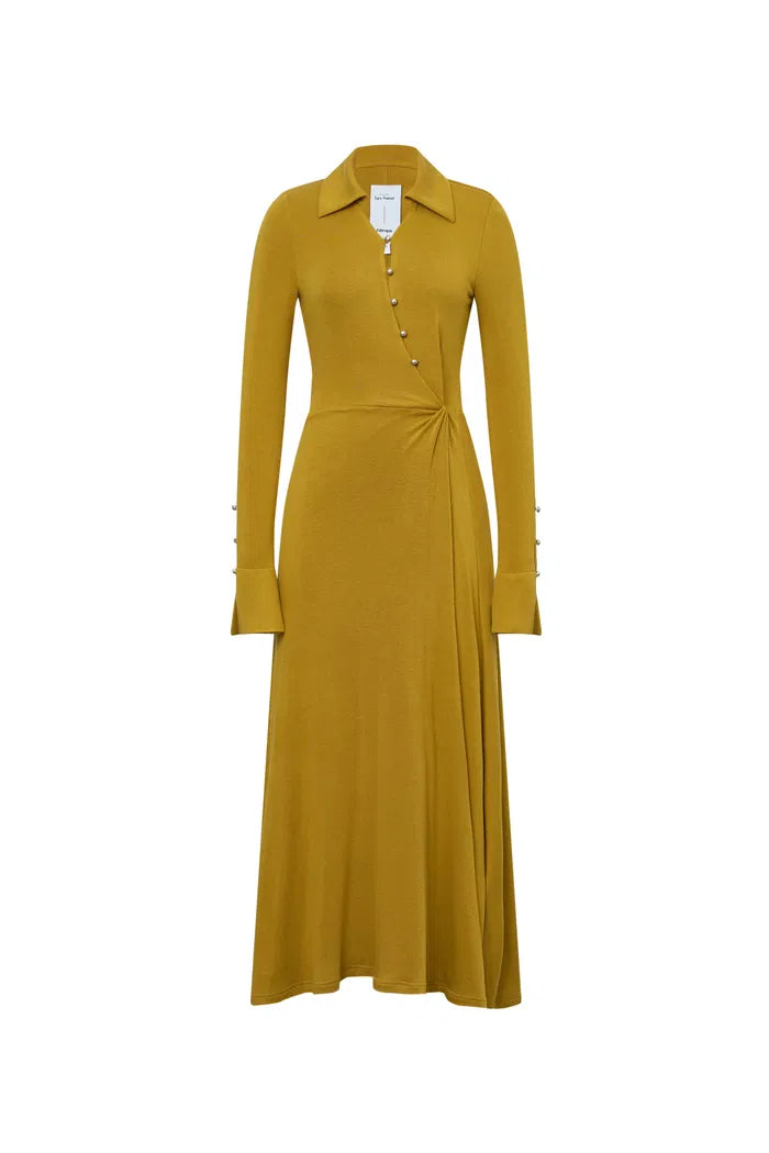El detalle de nudo lateral añade un giro fresco a este acogedor vestido de invierno. De talle alto con falda acampanada, te mantiene abrigada con tejido de mezcla de lana. Las mangas con botones y el escote asimétrico en V aportan un toque sutil a los looks para días fríos.