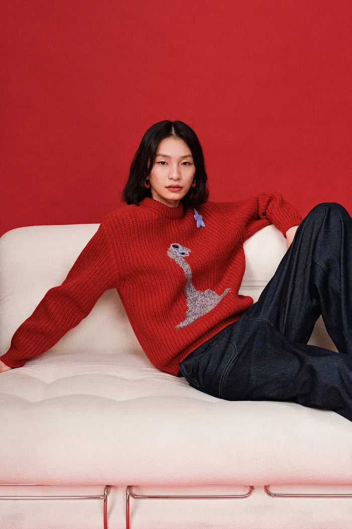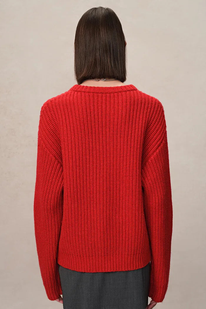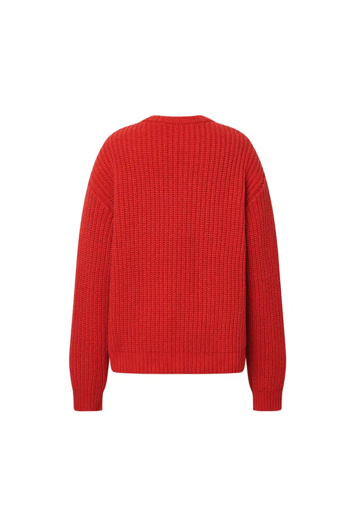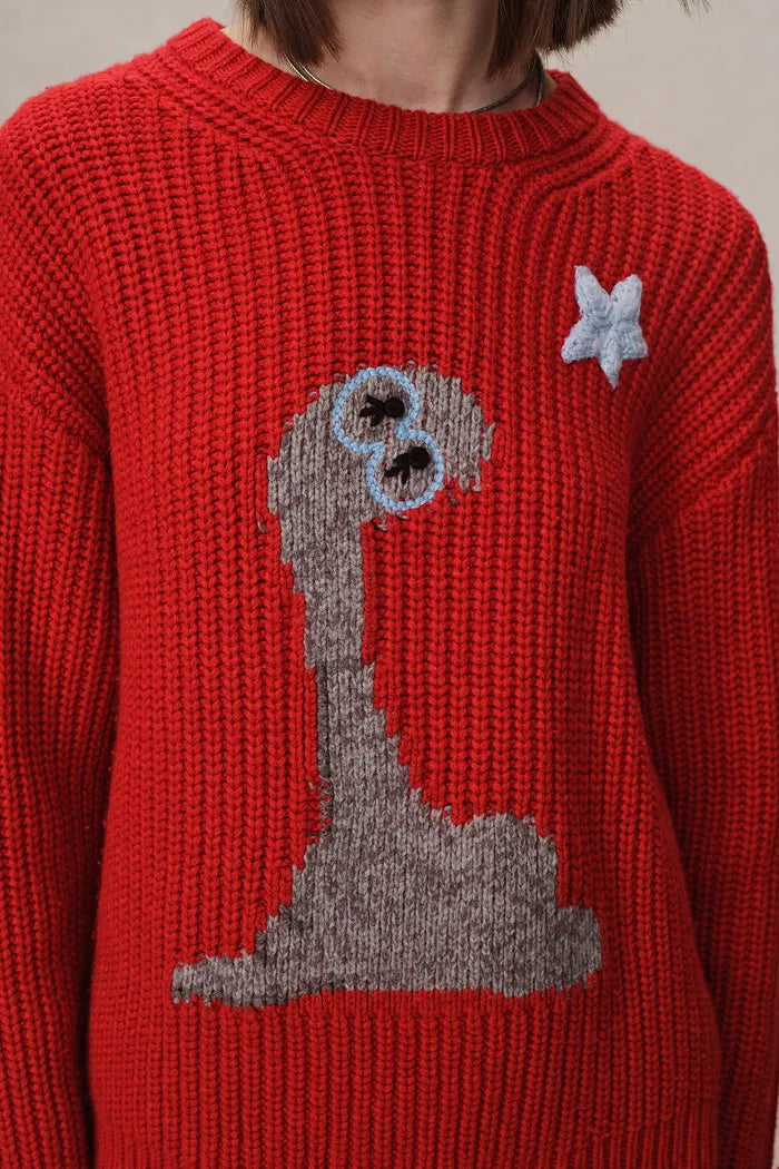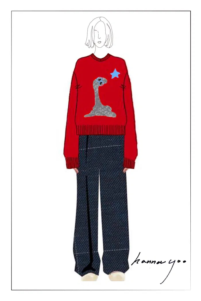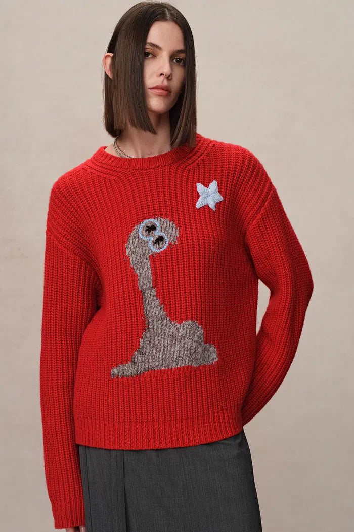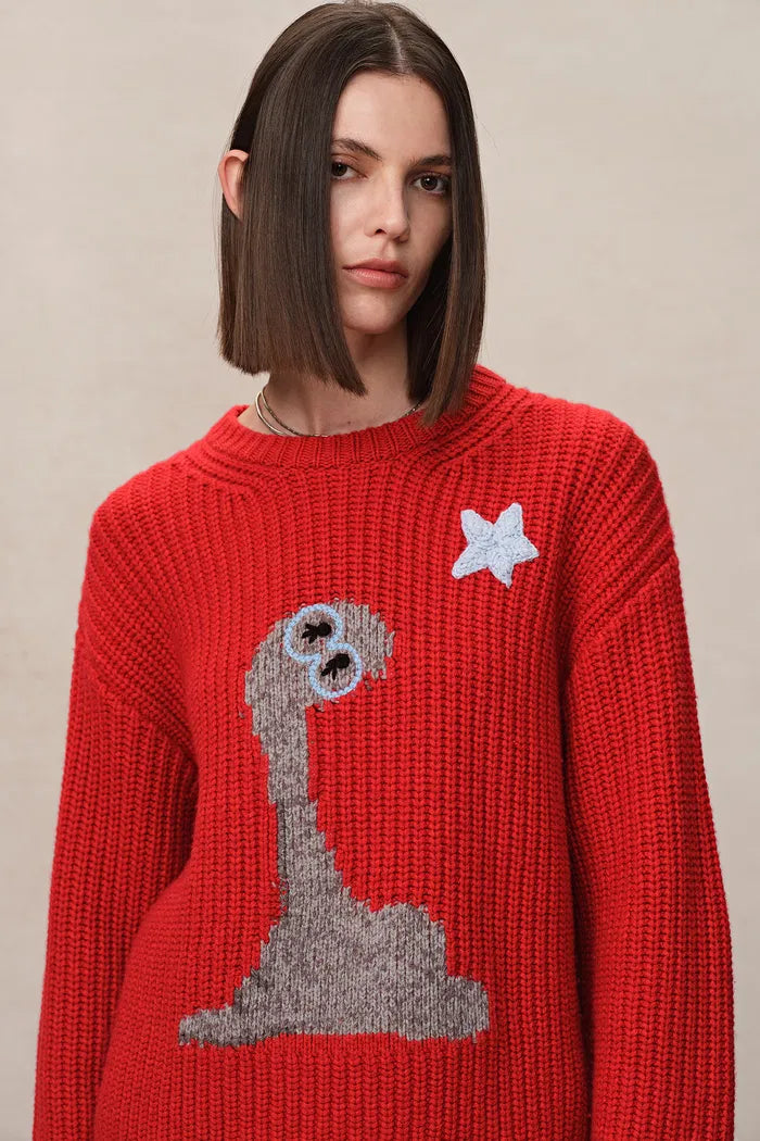Los tejidos de la abuela reciben una actualización audaz en este suéter grueso de merino. Motivos de estrellas bordados a mano brillan contra un fondo rojo vibrante, mientras que el ajuste relajado mantiene la comodidad. Es confort nostálgico con un giro moderno.