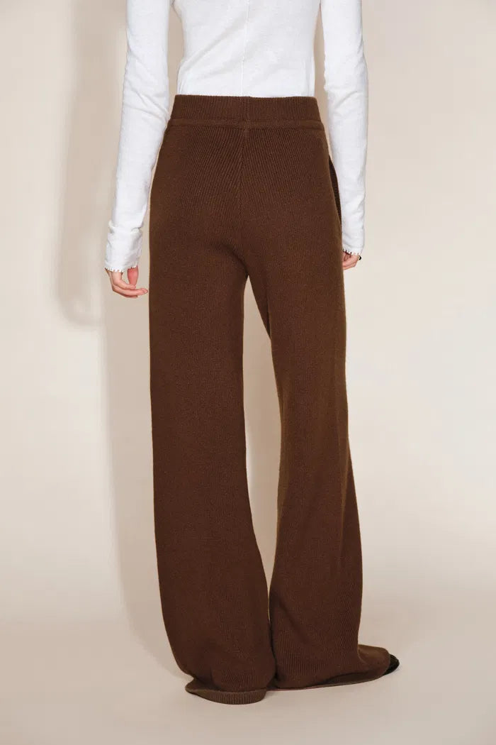Una silueta relajada de pierna ancha con cintura elástica y cordón ajustable. Los bolsillos laterales funcionales añaden dimensión, mientras que el tono marrón canela realza la textura acogedora de los hilos de pura lana — discreto y cálido sin esfuerzo.