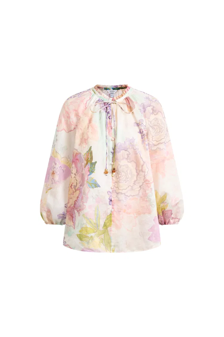 Esta prenda tiene la comodidad de una blusa suelta de verano, pero con un poco más de detalle. El cuello alto con volantes, el lazo con cuentas y las suaves mangas farol aportan una forma delicada a la silueta, mientras que el estampado floral la mantiene fresca para vestir en climas cálidos.