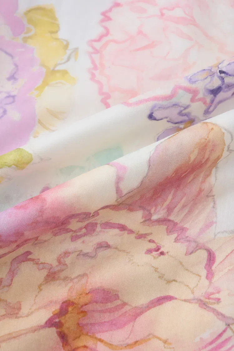 Tela ligera de mezcla de seda y lino con un drapeado suave y fluido. Semitransparente con estructura ligera, se mueve con facilidad y aporta un aspecto en capas al estampado floral en acuarela.