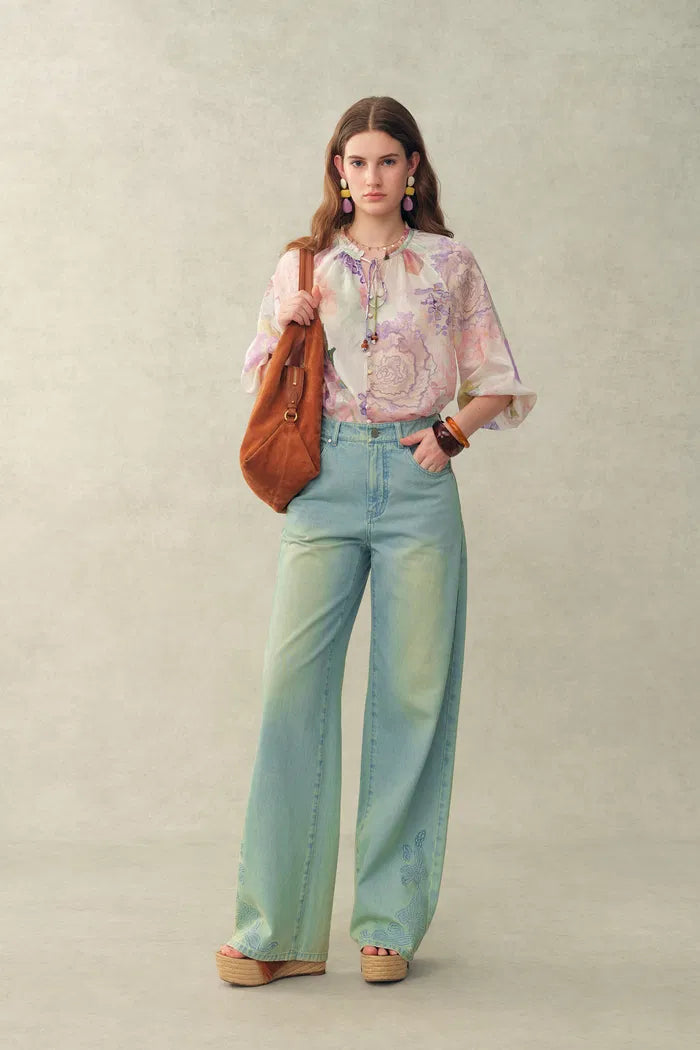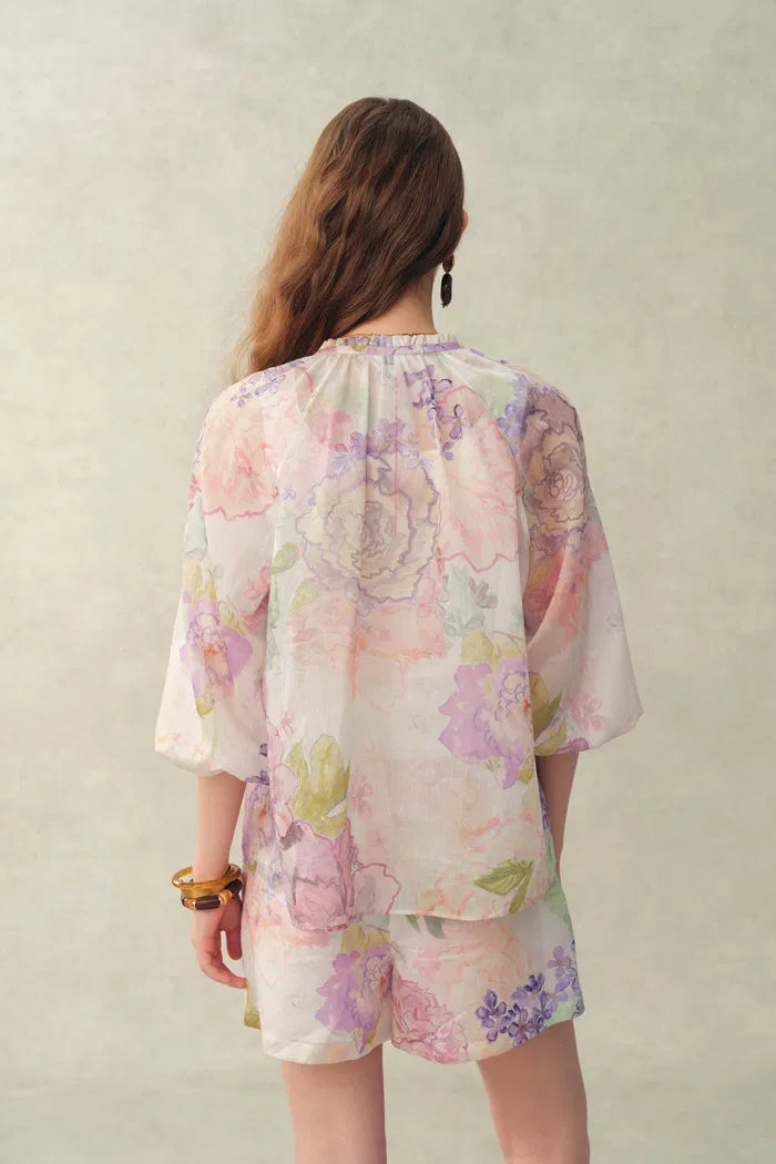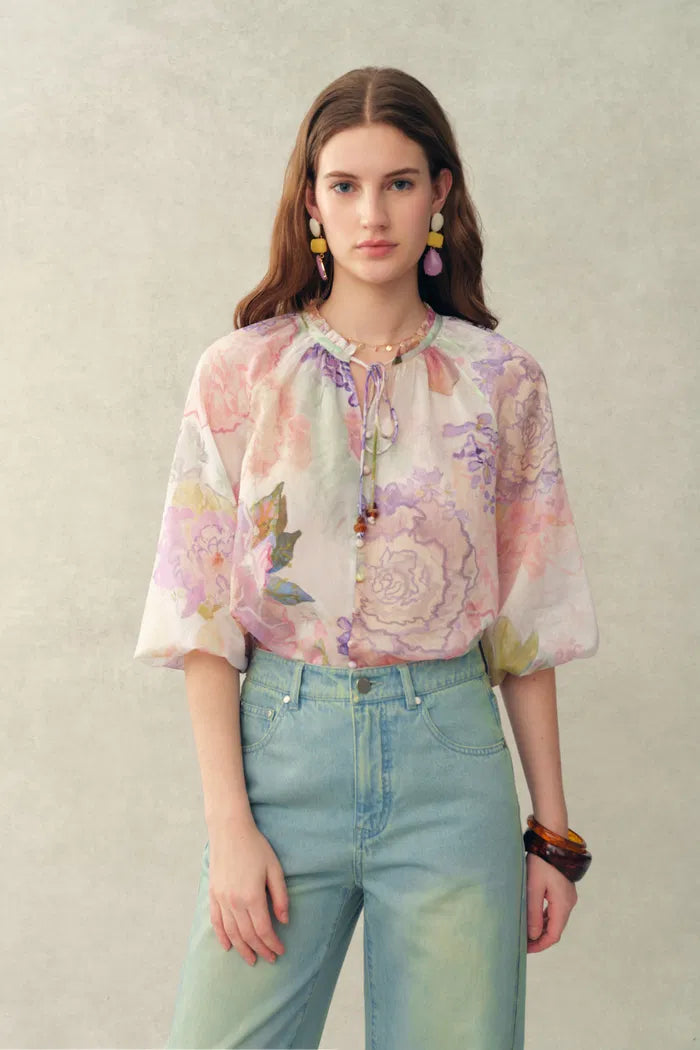 Blusa Yori con estampado floral pintado a mano, transparente, con mangas abullonadas y cuentas, en mezcla de seda y lino