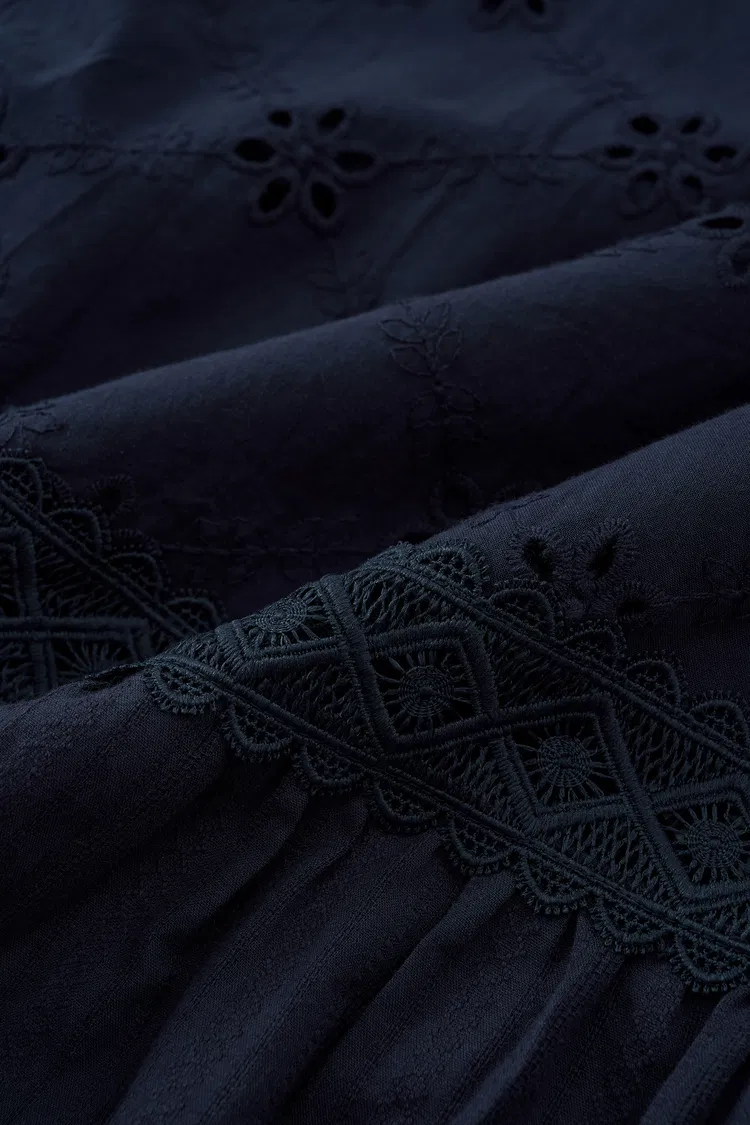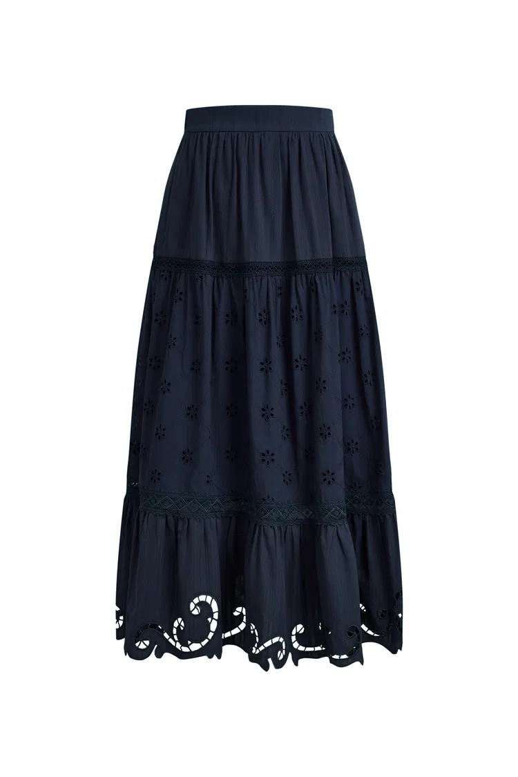 Falda larga azul Ivy con bordado calado en jacquard de algodón con encaje