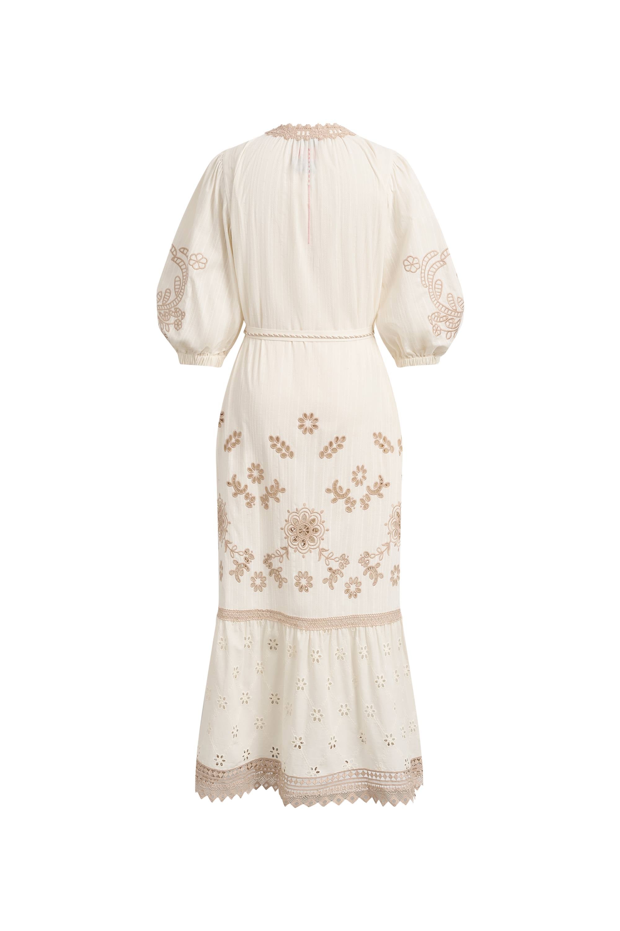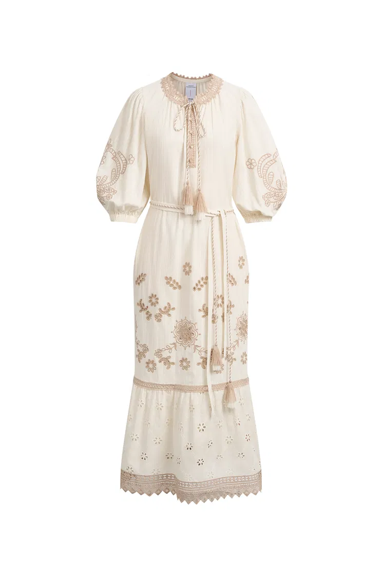 El bordado artístico de contraste se une al jacquard ligero en este vestido midi relajado. Con un corte suelto estilo kaftán y bolsillos ocultos funcionales, es una pieza bohemia audaz diseñada tanto para el estilo como para la practicidad diaria.