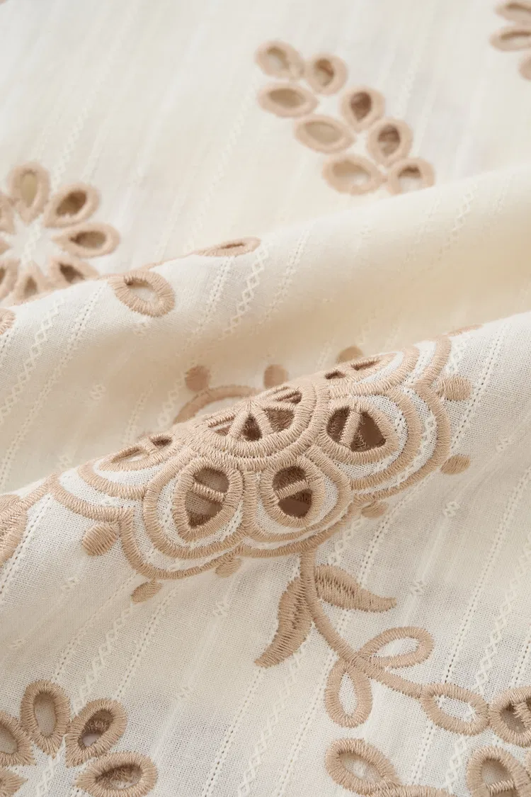 Mini jacquard 100% algodón con bordado floral para textura y profundidad extra. Ligero, transpirable y con un drapeado suave para una forma oversized fácil.