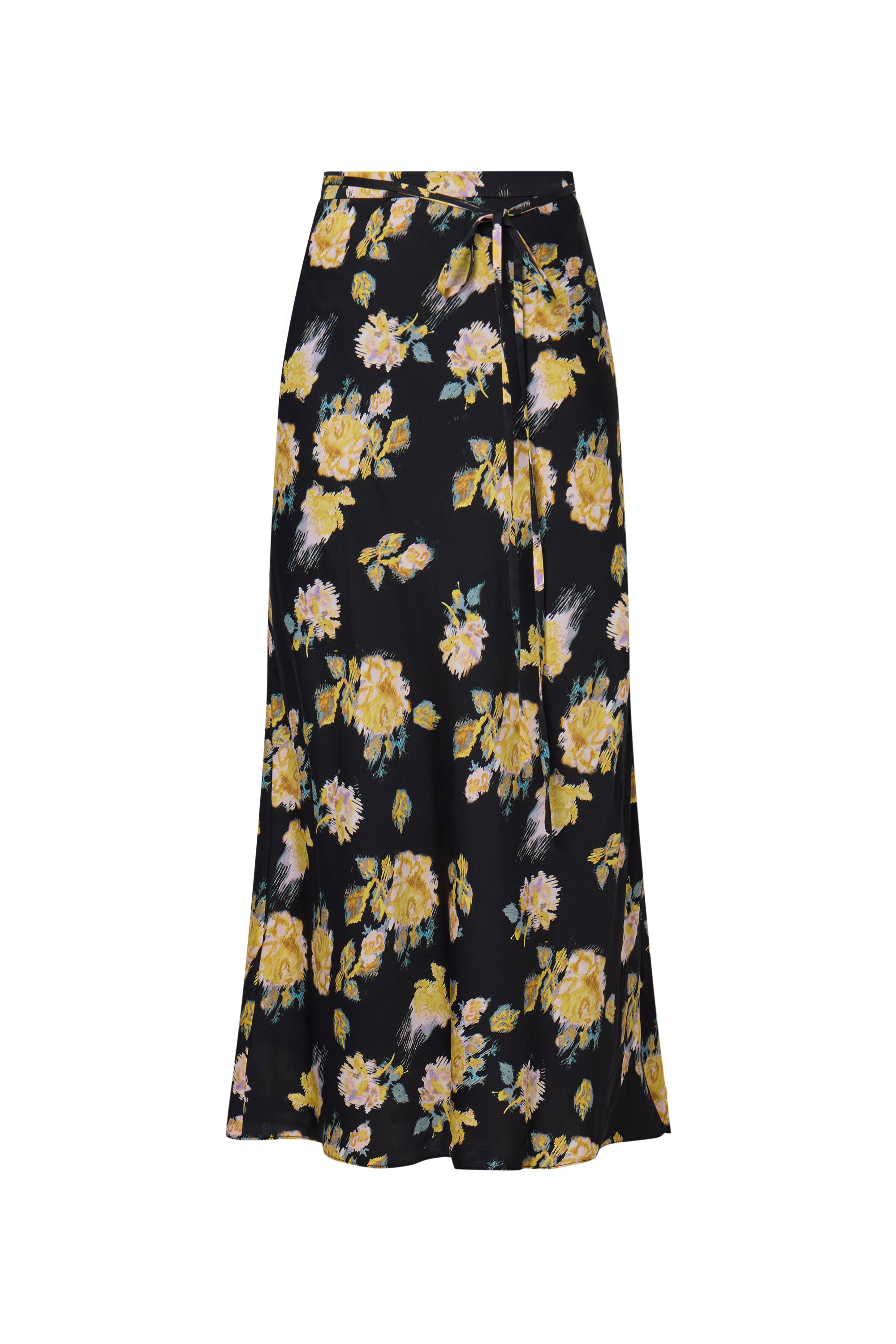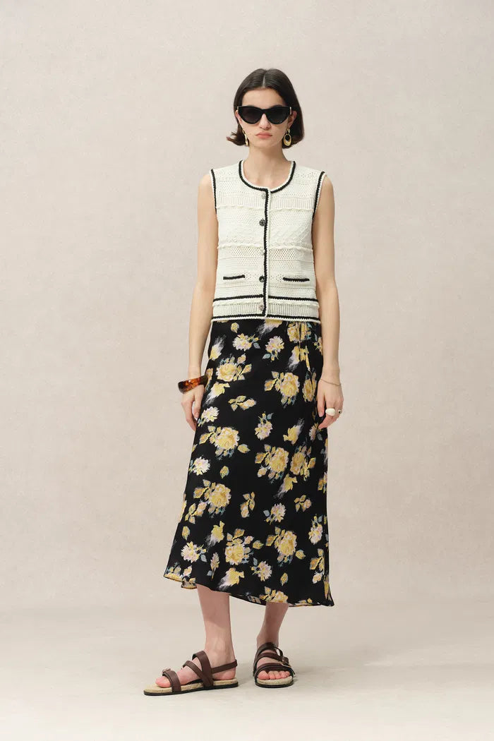Con un atractivo moderno para la falda midi floral, este diseño presenta rosas amarillas abstractas y pictóricas sobre un fondo negro audaz, complementado con prácticos bolsillos laterales ocultos y una cintura con lazo fácil para un estilo sin esfuerzo en clima cálido.
