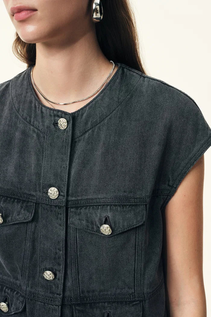 Este chaleco DENIM gris ahumado presenta un cuello redondo y hombros anchos para una presencia urbana fuerte. Cuatro bolsillos utilitarios y botones plateados añaden un toque funcional y de ropa de trabajo a una silueta elegante y corta.