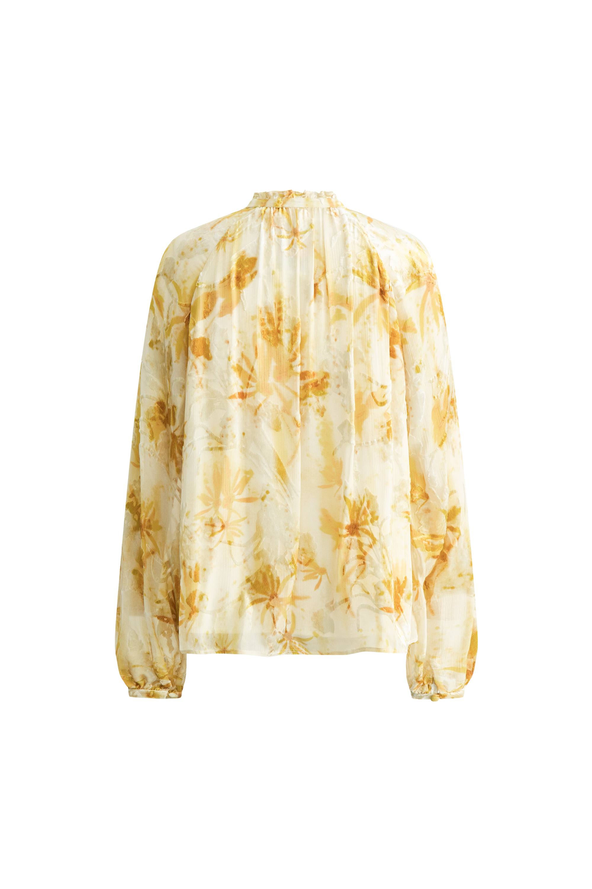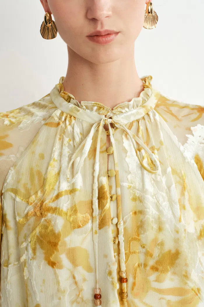 Esta blusa de seda burnout ofrece detalles inspirados en palacios para un vestir moderno. Las mangas transparentes equilibran el cuello alto estructurado. Los motivos florales personalizados captan la luz natural maravillosamente.