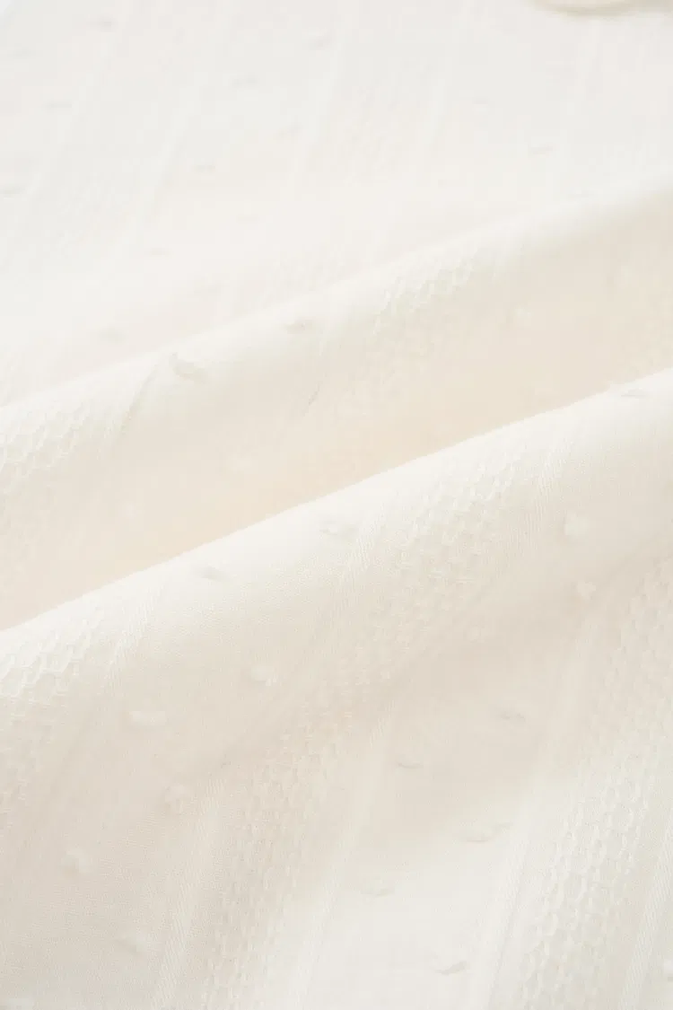 Jacquard ligero 100% algodón con una textura sutil de puntos. Suave, transpirable y cómodo para el cuerpo, mantiene su sensación aireada incluso con detalles en capas.