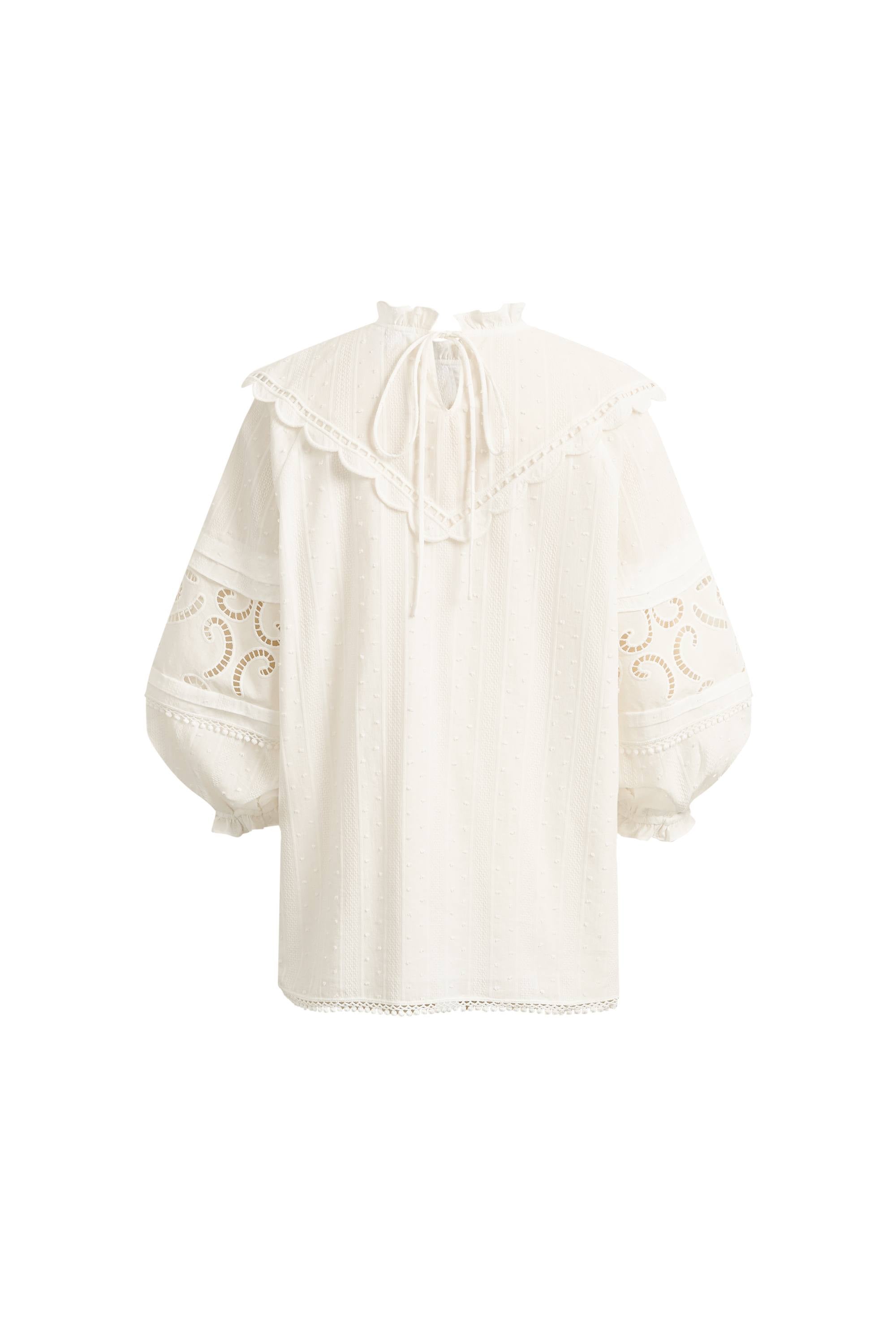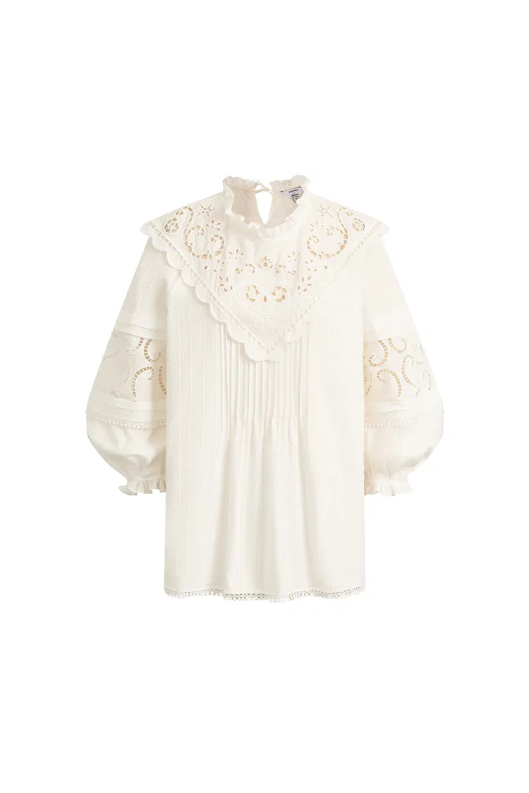 Esta blusa color marfil utiliza bordado en forma de V y delicados parches de encaje para crear una silueta poética y aireada. Es una pieza de precisión que equilibra el detalle decorativo con la calidad simple y duradera del algodón premium.