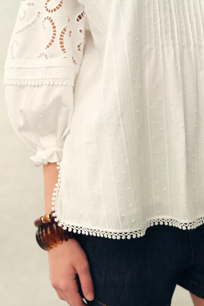 Blusa Iris con Bordado en Costura en V y Mangas Abullonadas en Jacquard de Algodón