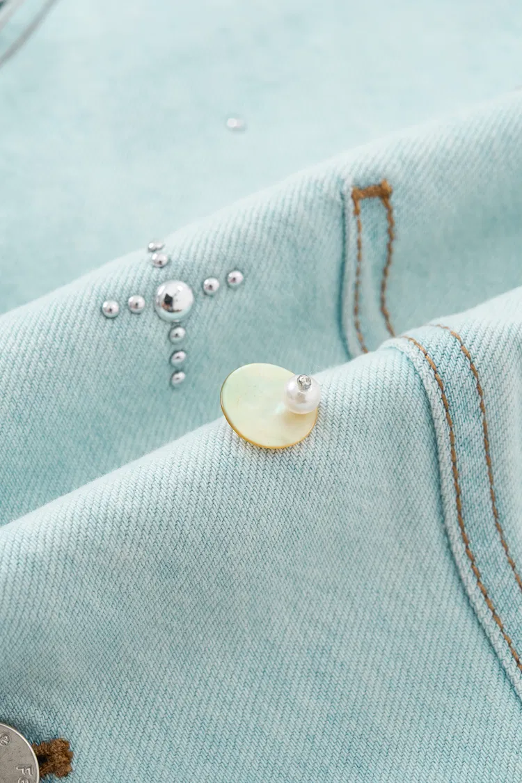 Denim de algodón puro con un acabado lavado suave y estructura ligera para un uso cómodo en primavera y verano. El tono azul cielo claro y los detalles con cuentas añaden un toque festivo y juguetón.