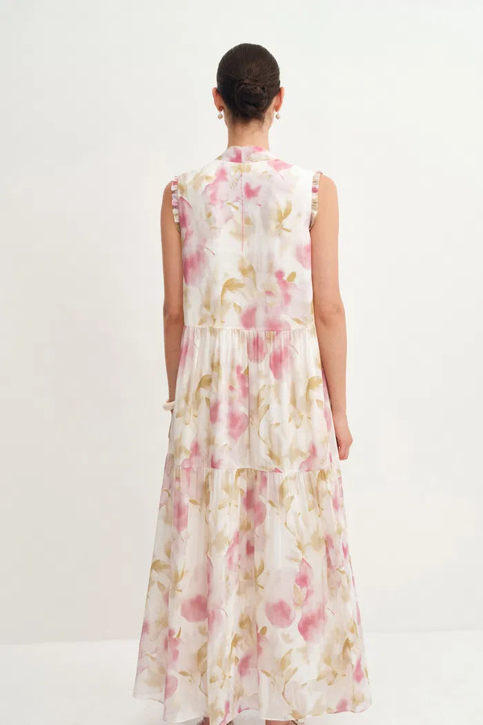 Este vestido Lina muestra orquídeas pintadas a mano en estilo acuarela sobre una ligera mezcla de seda y lino. El escote en V presenta lazos fluidos para un movimiento romántico, mientras que los pliegues en las mangas añaden dimensión. La silueta en línea A crea el lienzo perfecto para la artesanía botánica.