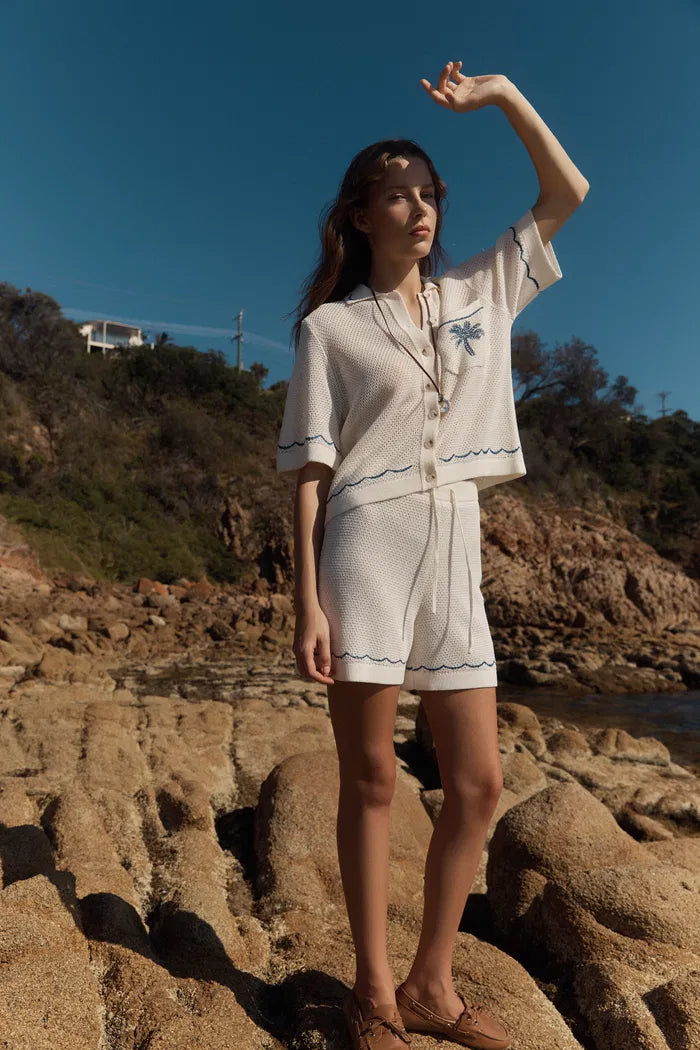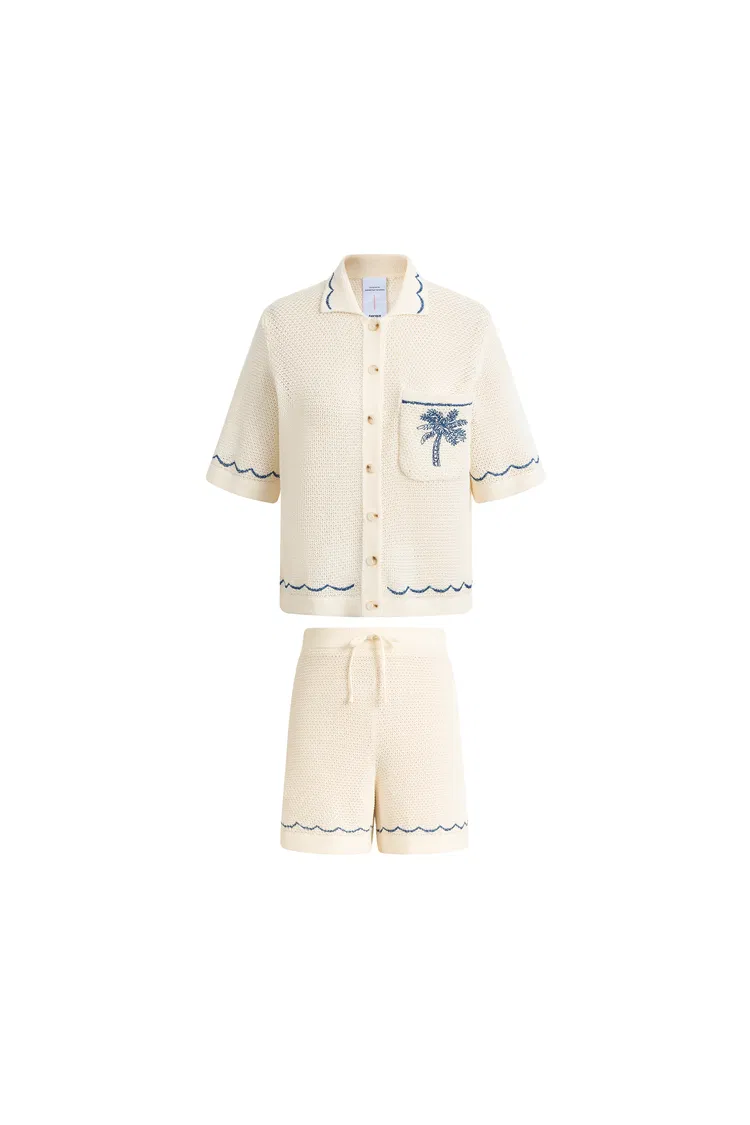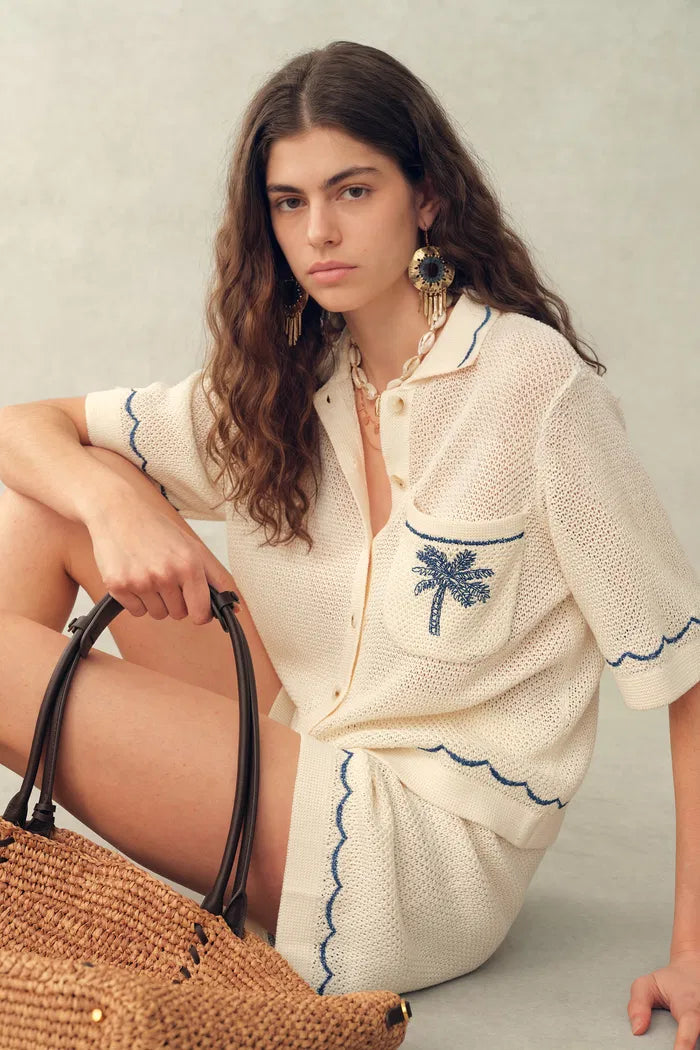 Una versión más fresca del conjunto de verano, este combina una camisa de punto abierto con shorts fáciles de línea A para un look que se siente ligero pero bien armado. El bordado de palmeras añade una nota vacacional divertida sin que parezca demasiado temático.