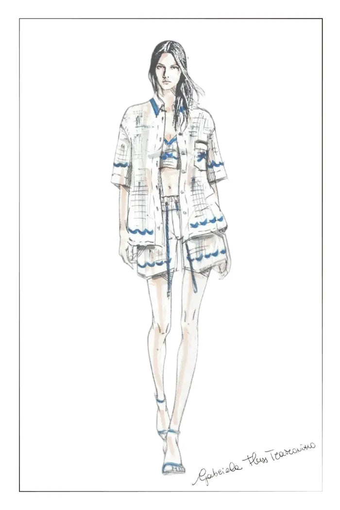 Gabriela balances land and sea contrasts throughout this collection. Strong structured fabrics like denim meet light Tencel-linen blends, while white serves as a base to harmonize blue, sand, and straw color palettes.