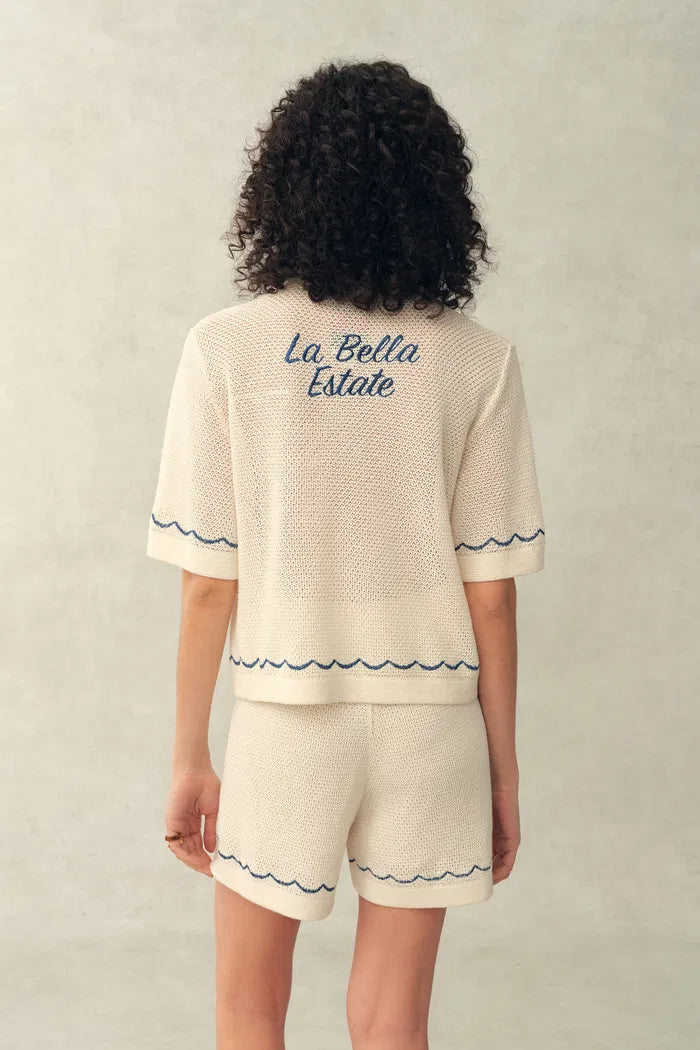 Conjunto de cárdigan con botones y shorts Oriel Palm con bordado artesanal en mezcla de lino tejido