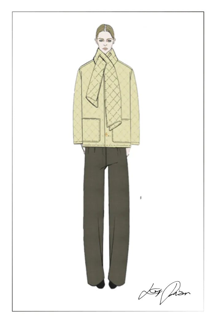 El acolchado en rombos combina con los detalles de la bufanda a través de un ribete de cuadros refinado que hace referencia a la herencia inglesa. El gris-beige suave recibe un toque de color con ojales rojos brillantes. El corte relajado es ideal para aventuras al aire libre en otoño.
