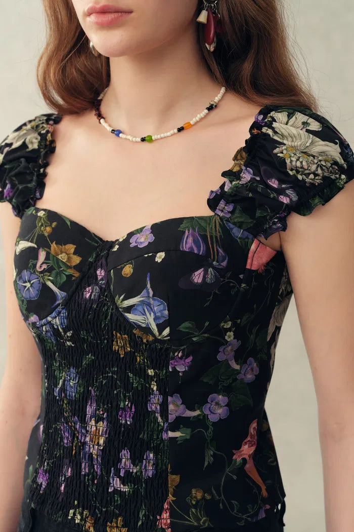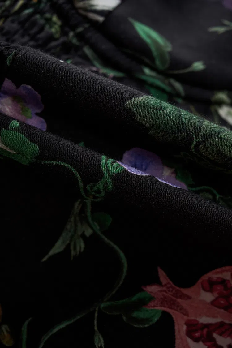 Una versión más ligera del estilo floral, esta prenda de seda y algodón se siente suave, aireada y ligeramente moldeada. La cintura fruncida define el cuerpo sin apretar, mientras que el detalle de la correa ajustable y las líneas fluidas la mantienen fresca para los días de verano.