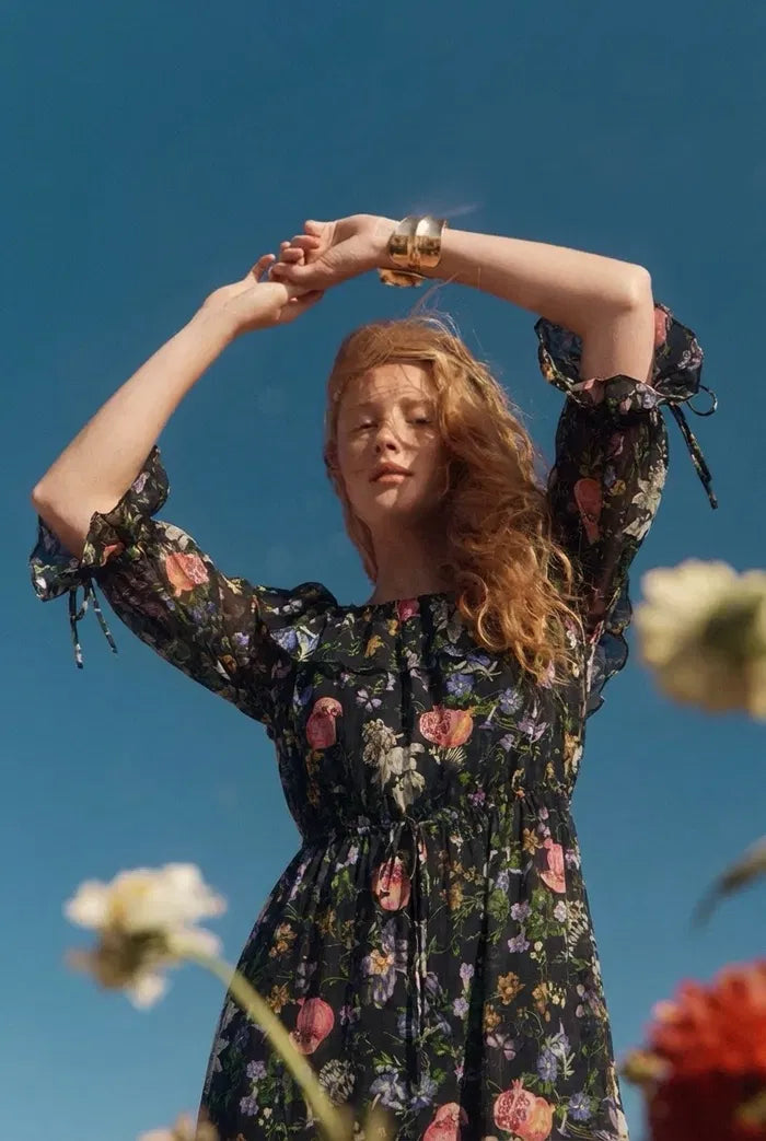 Confeccionado con georgette de seda premium, este vestido con hombros descubiertos presenta estampados de granada pintados a mano y delicadas texturas clip-spot. La cintura ajustable con cordón y el escote con volantes permiten un estilo versátil, combinando movimiento sin esfuerzo con una energía artística rica.