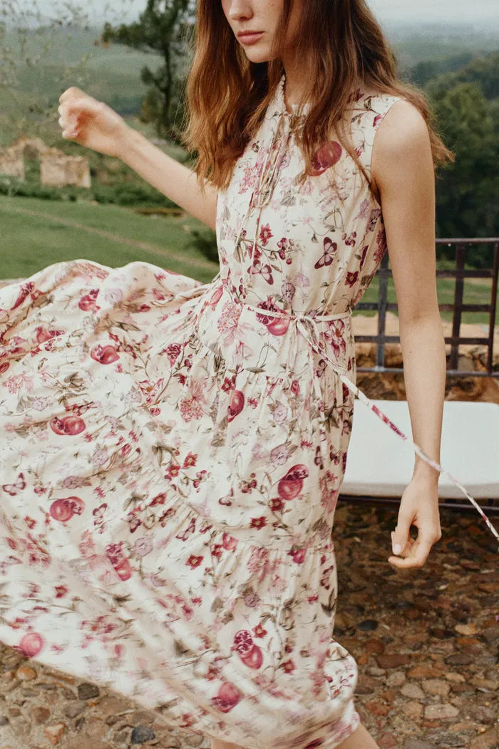 Este vestido floral tiene una elegancia tranquila, equilibrada por una silueta maxi relajada y un ajuste que fluye suavemente. El cuello con lazo aporta un poco de movimiento en la parte superior, mientras que la mezcla de lino mantiene todo el look transpirable y con textura natural.