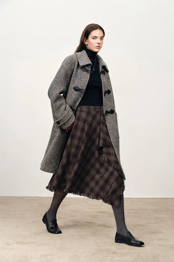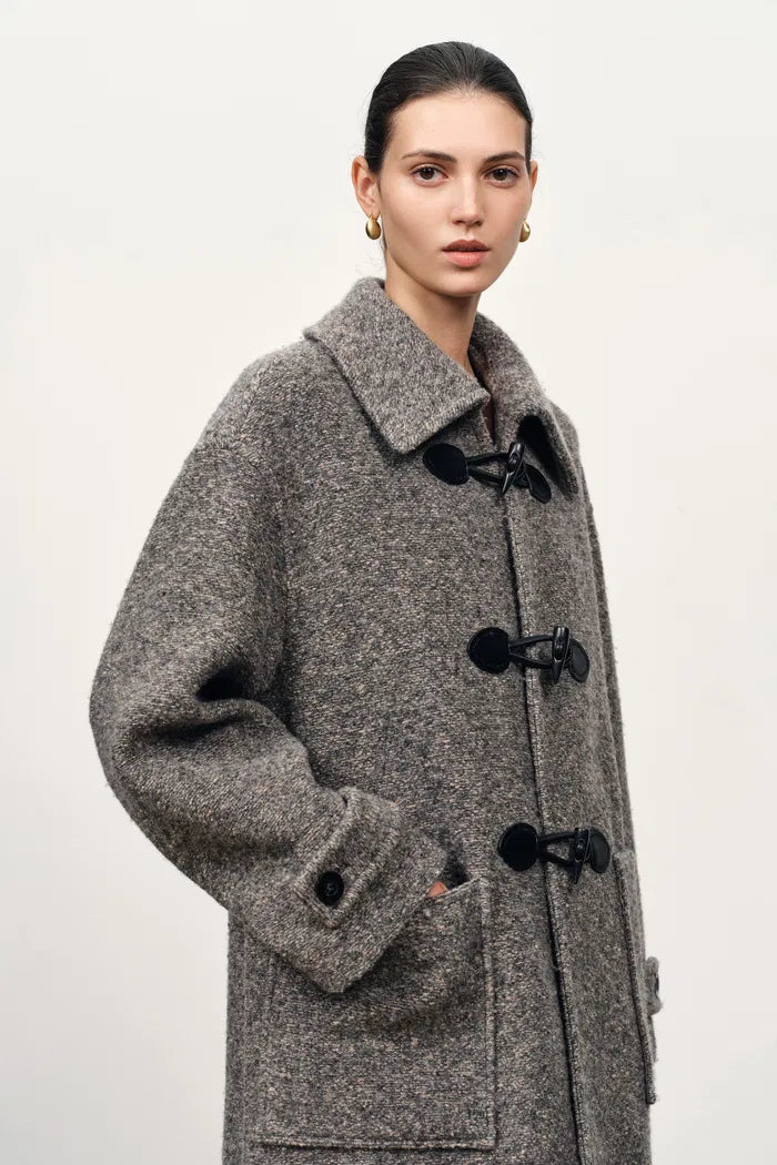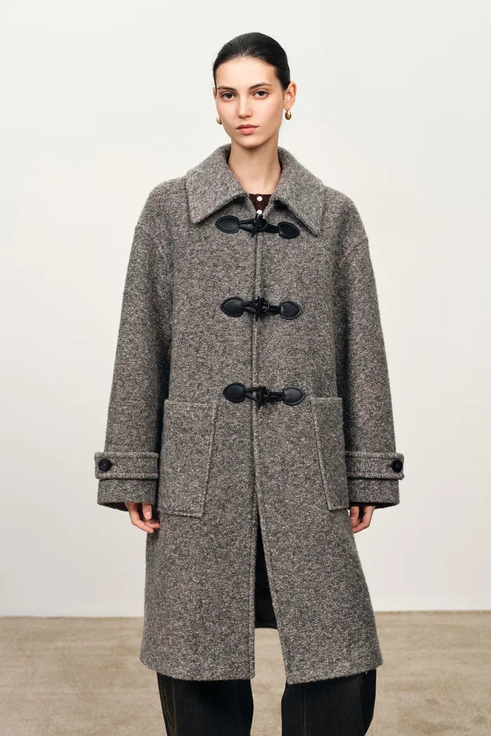Silueta recta y relajada con lana de textura tejida que crea una elegancia casual, mientras que tres botones de cuerno hacen referencia al estilo académico. La construcción suelta permite un cómodo uso en capas manteniendo un atractivo estructurado para el uso diario.