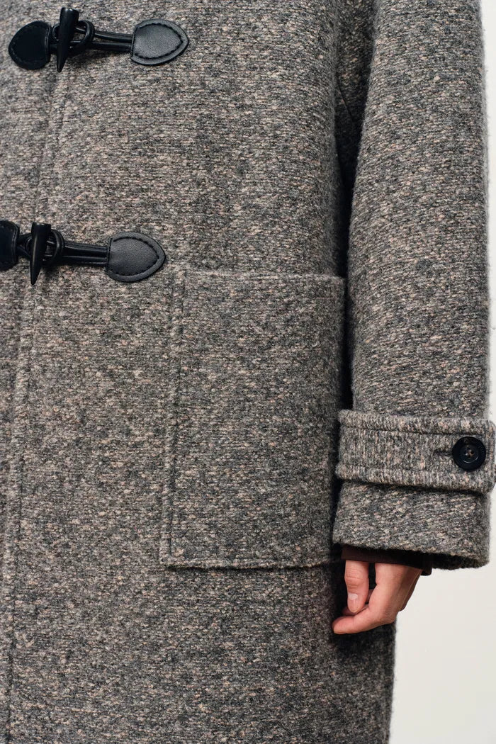Más suave que los tweeds tradicionales. Mezcla vintage de hilos múltiples con textura natural. Gris humo con motas de café para una nostalgia inspirada en el cine.