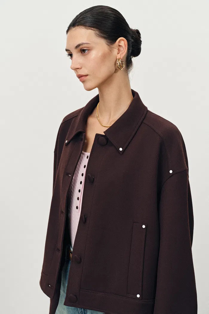 Tachuelas metálicas y ojales terminados a mano aportan credibilidad de ropa de trabajo a esta chaqueta de lana. El marrón oscuro desarrolla una rica pátina con el tiempo.