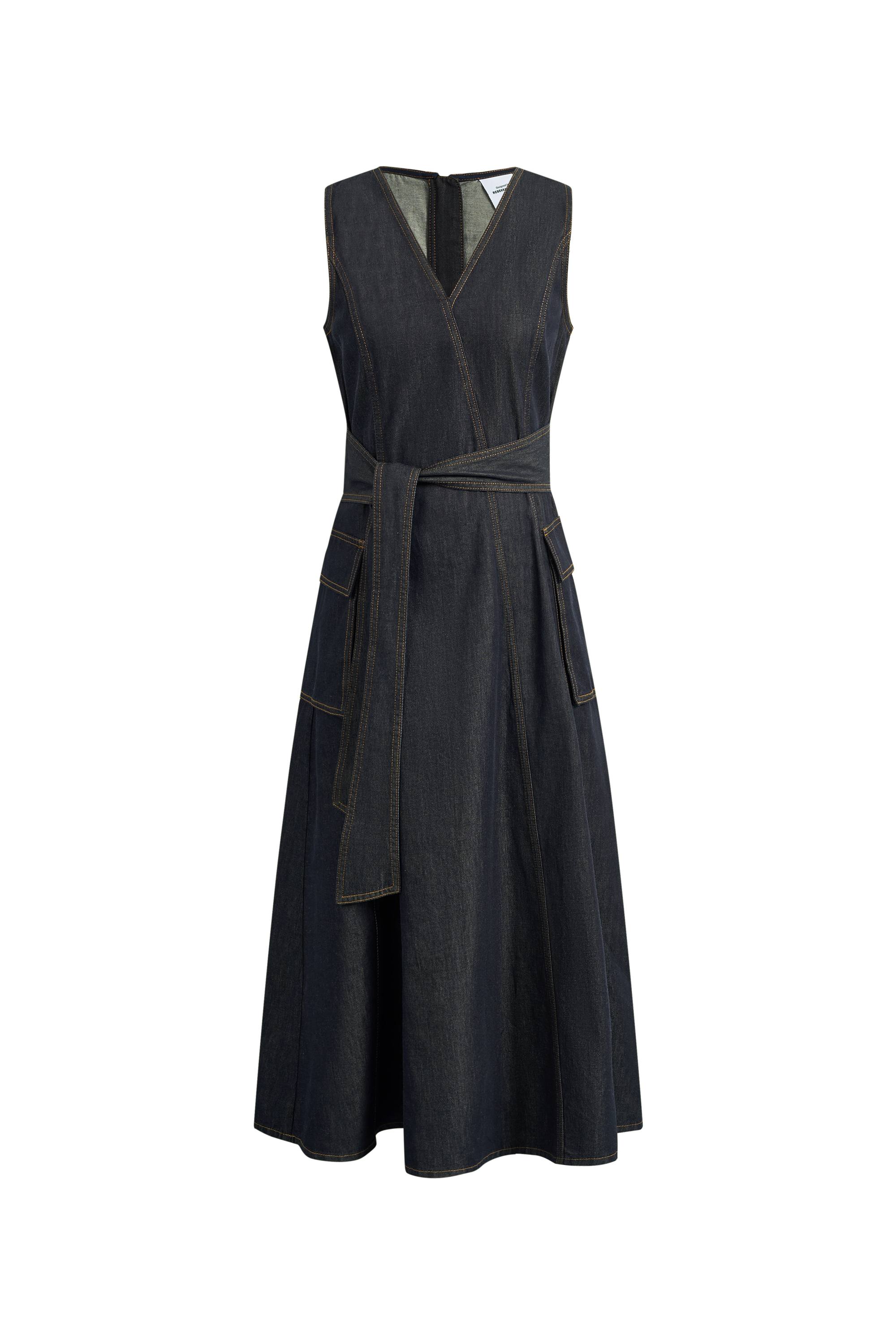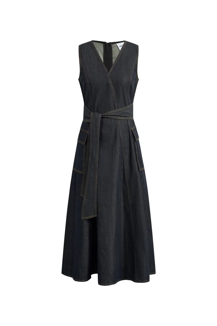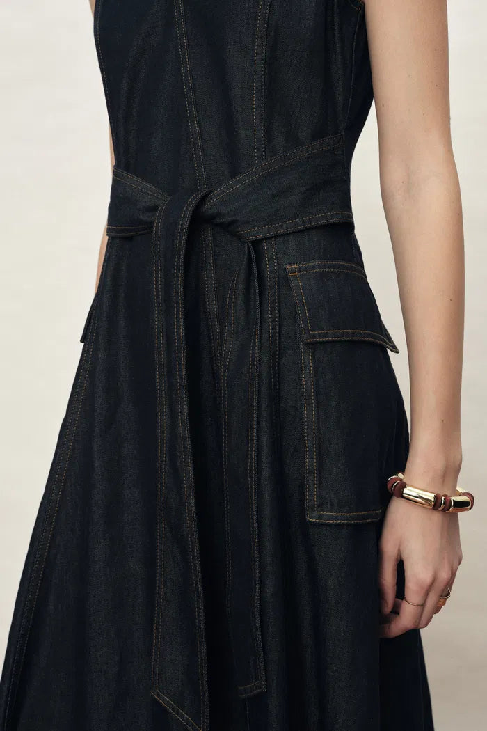 Une interprétation plus nette de la robe en denim, ce modèle sans manches suit la taille avant de tomber en une robe en A épurée. L'encolure en V garde la ligne ouverte, tandis que la ceinture à nouer et le denim en coton lavé la rendent particulièrement facile à porter en été.