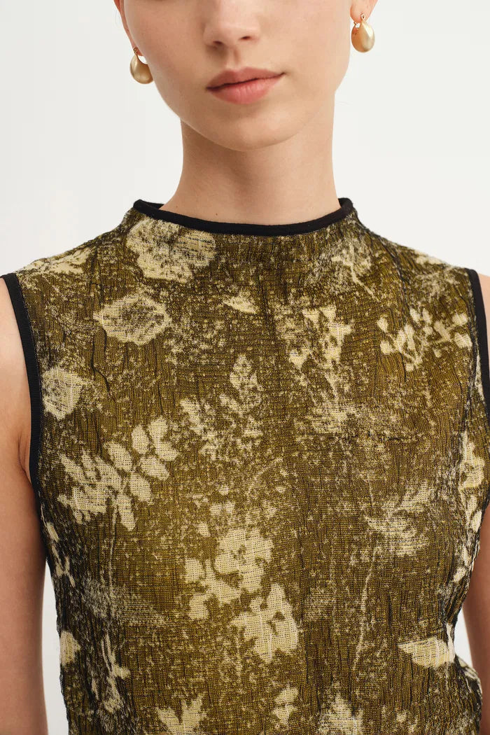 Ce débardeur en maille botanique capture des motifs printaniers en jacquard à trois fils. Le col montant apporte de l'élégance à la silhouette ajustée. Le patrimoine de l'impression végétale rencontre le tricot contemporain.