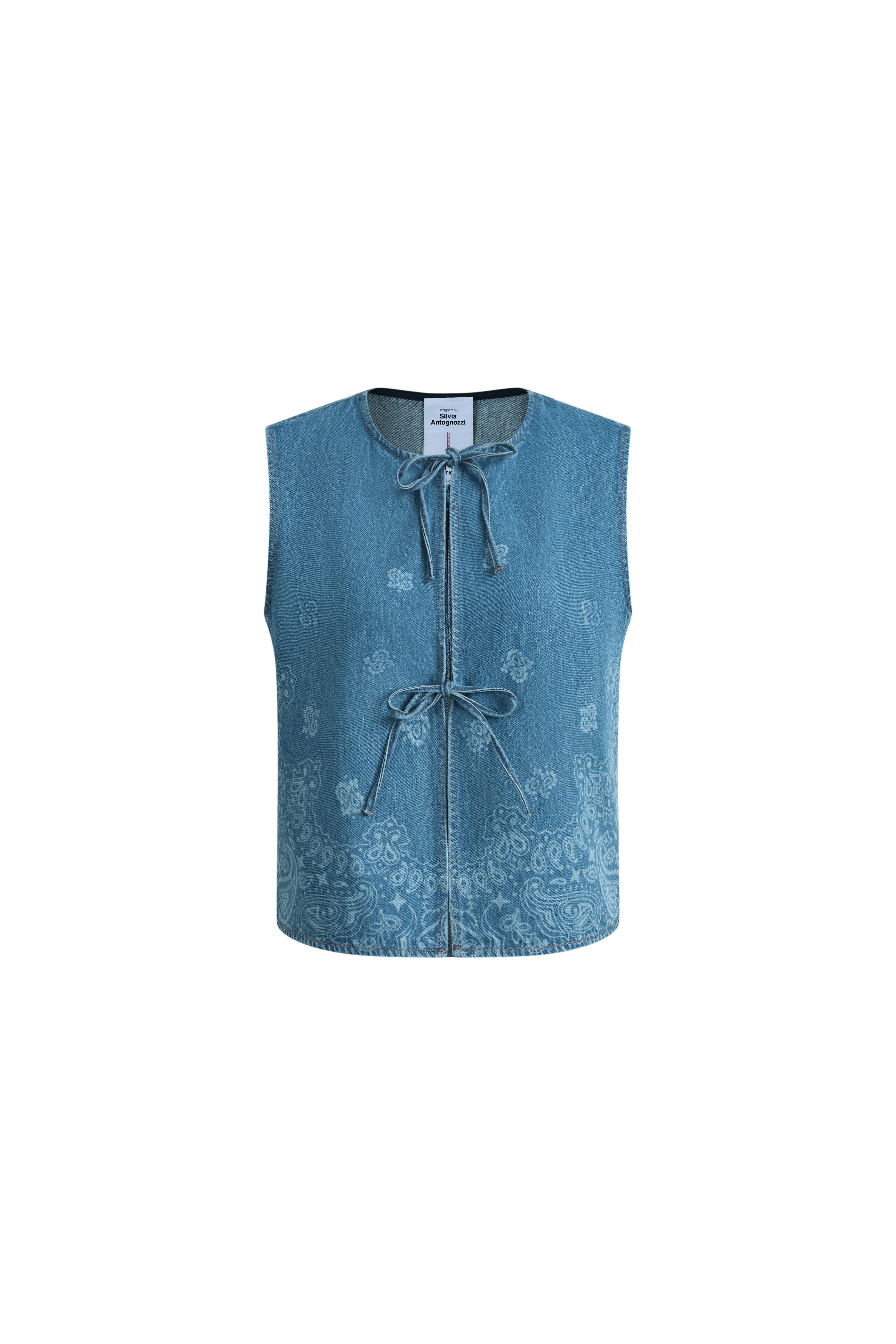 Des motifs cachemire découpés au laser adoucissent ce gilet en denim et y ajoutent une note botanique. La coupe courte et la fermeture nouée à l'avant apportent une touche ludique et artisanale, en faisant une couche facile à porter sur un débardeur ou une robe simple.