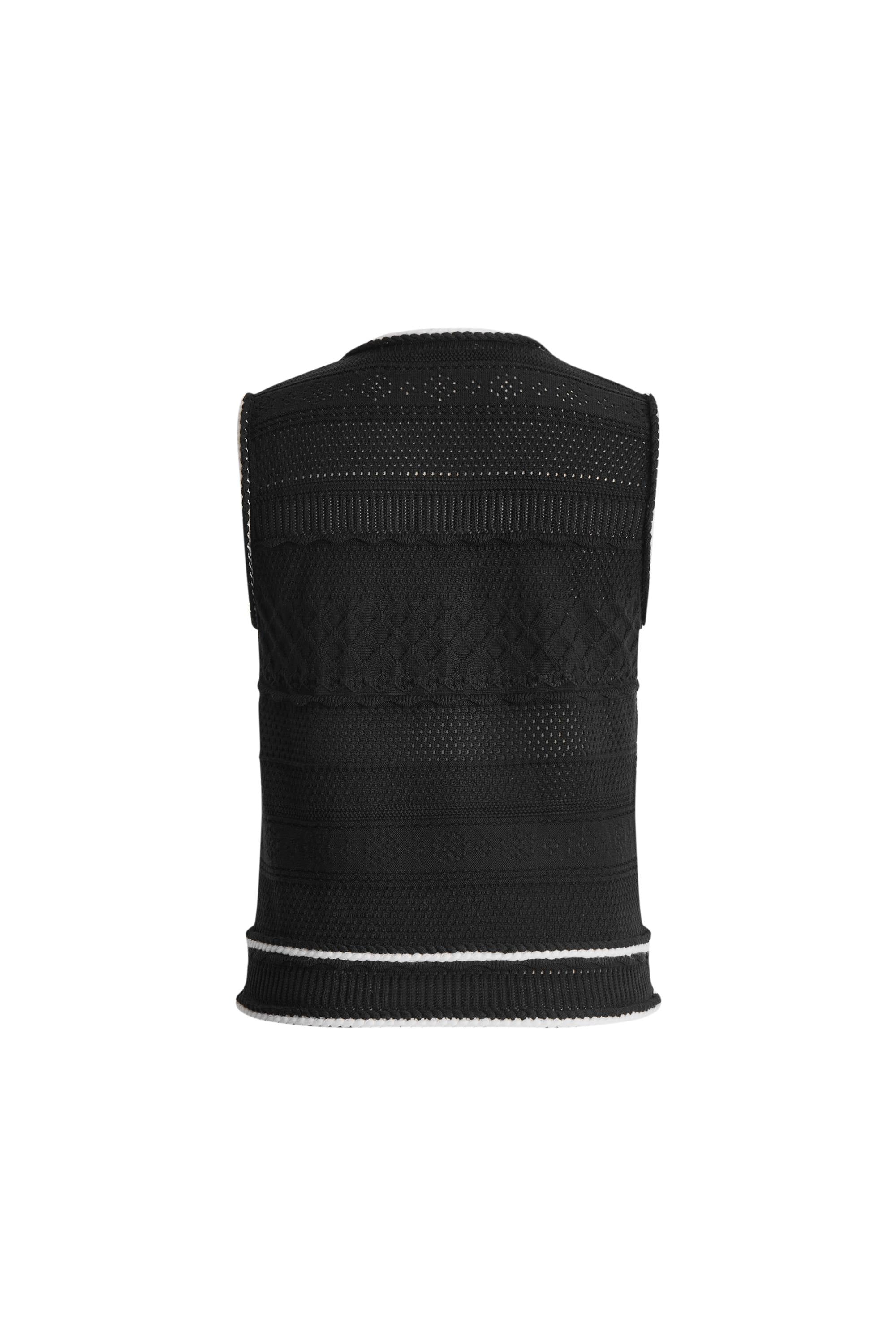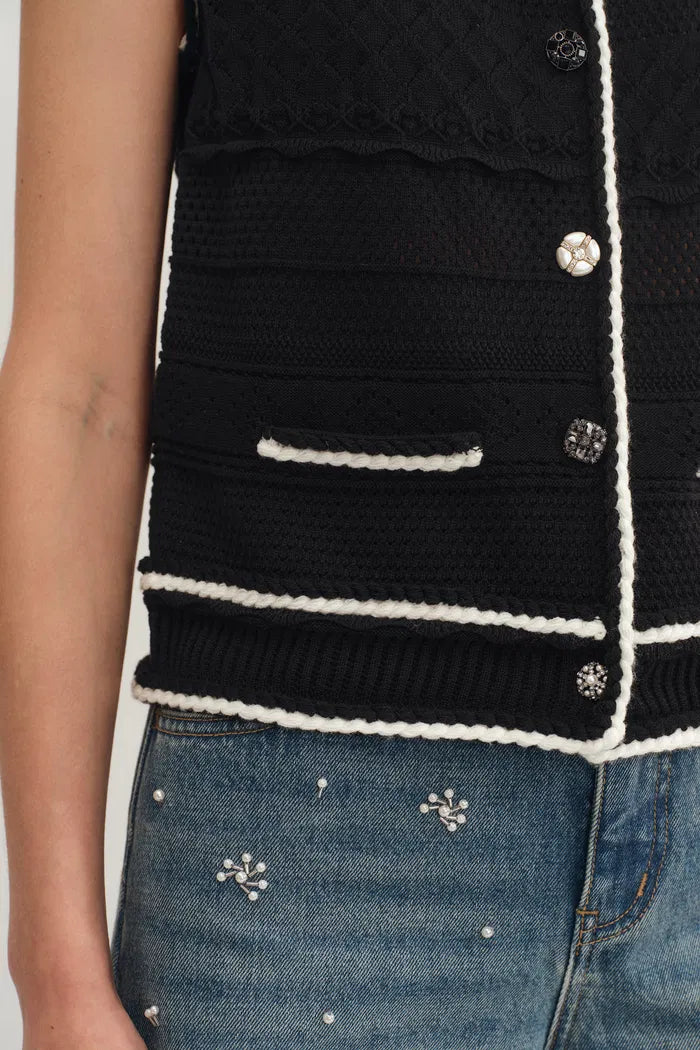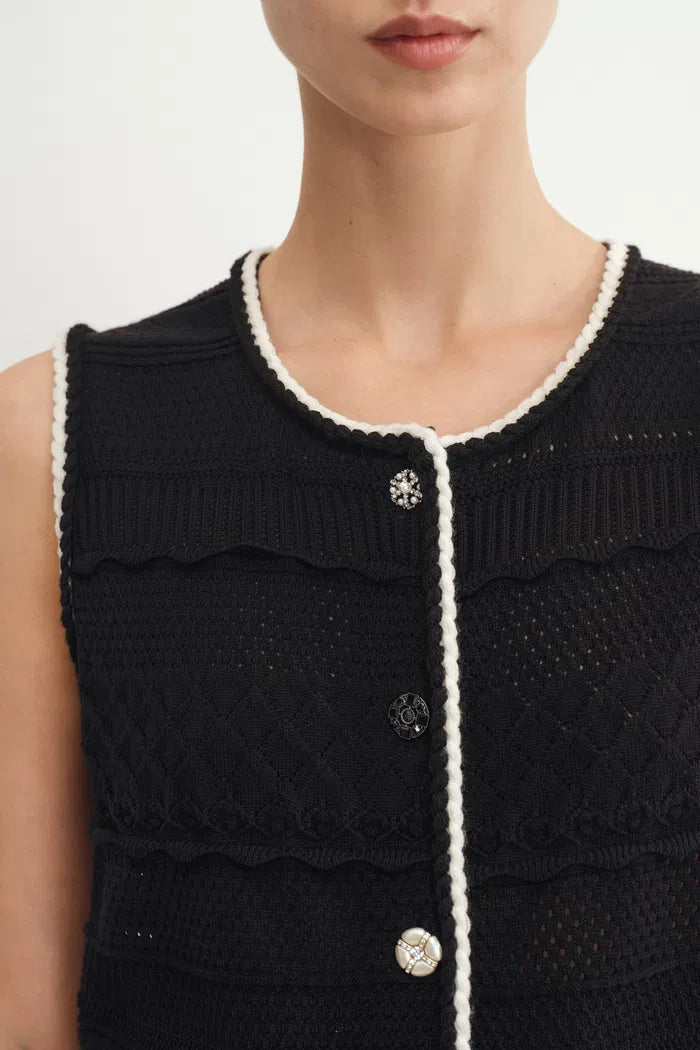 Ce top sans manches Silvy transforme le tricot classique avec plusieurs textures et cinq boutons en cristal uniques. La coupe décontractée et carrée offre du confort, tandis que les motifs de points complexes créent de la dimension. Parfait en pièce unique ou pour des looks superposés qui demandent une touche d’éclat.