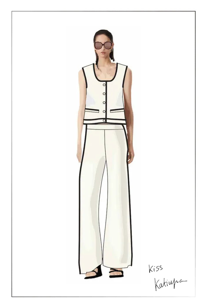 Katiuscia designs for women who love to express their unique personality through details. Black leads the way, softened by hints of vanilla white, warm cappuccino brown, and ice blue. Gold accents highlight the tailoring and add richness. For her, clothing becomes a way to express personal freedom and stand out naturally.