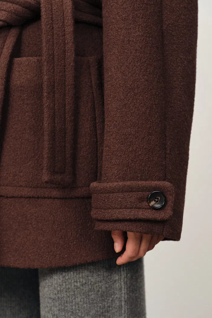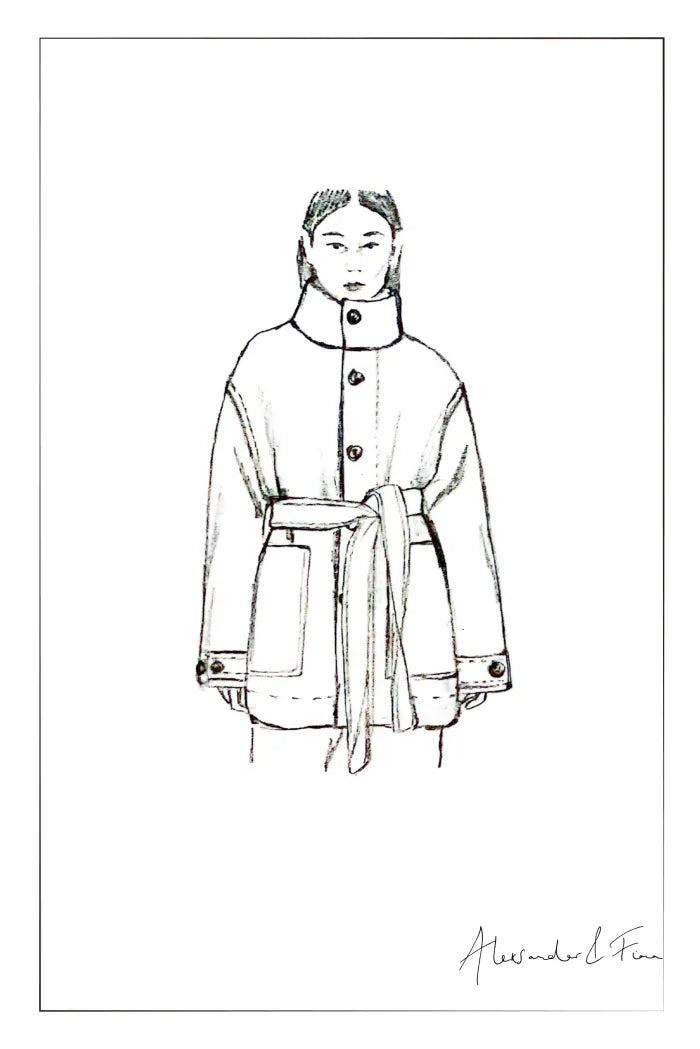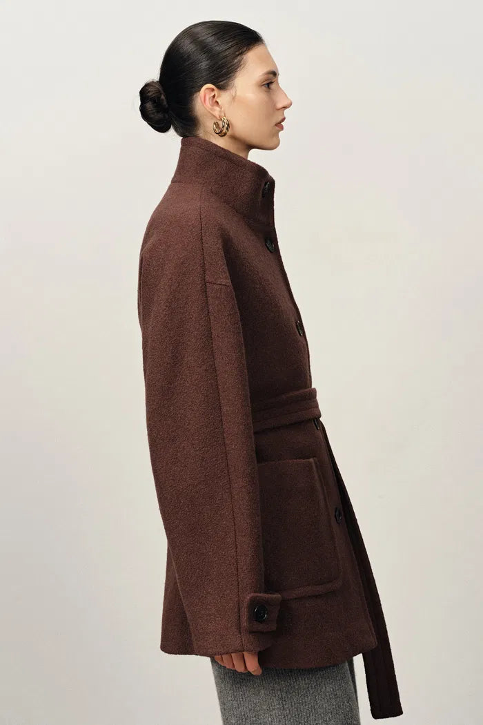 La silhouette décontractée et raccourcie offre une praticité quotidienne grâce à l'épaule tombante à l'avant qui rejoint l'épaule raglan à l'arrière pour des lignes fluides. Le col montant et les détails de la ceinture assurent une protection contre le vent et la chaleur. La laine tricotée apporte une texture légère avec une aisance décontractée.
